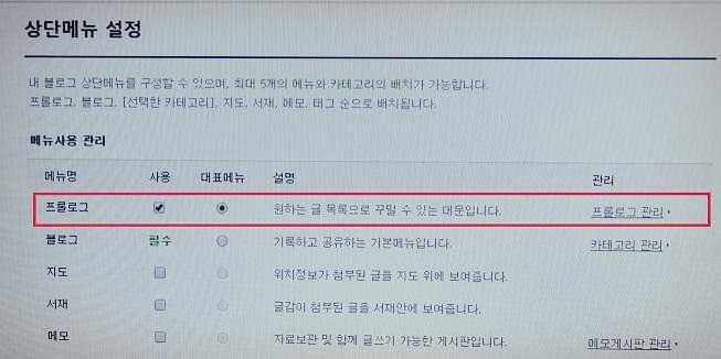 다시 뒤로가기 해서 상단메뉴 설정에 프롤로그 아래에 있는 메뉴명 블로그 오른쪽에 있는 카테고리 관리를 눌러줍니다.