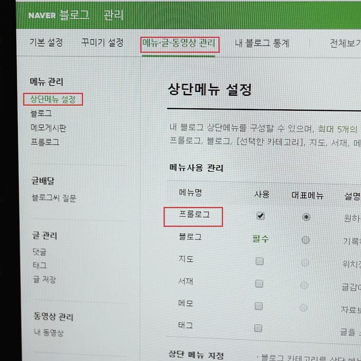 메뉴글.동영상 관리로 들어갑니다. 상단메뉴설정을 보시면 프롤로그 부터부터 정리하겠습니다.