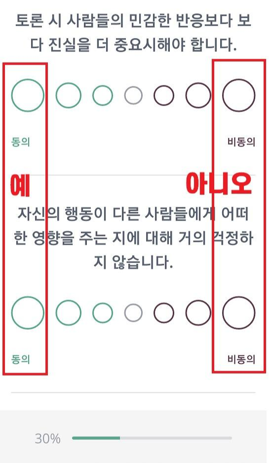 왼쪽 동의가 예에 해당하고 오른쪽 비동의가 아니오라고 생각하시면 됩니다.