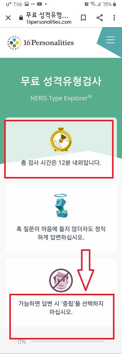 검사시간은 12분내외로 하셔야하고 가능한 중립을 선택하지 말라고 나옵니다.