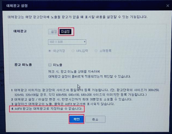 대체광고는 지정할수 없다고 되어있어 그냥 확인을 눌렀습니다.