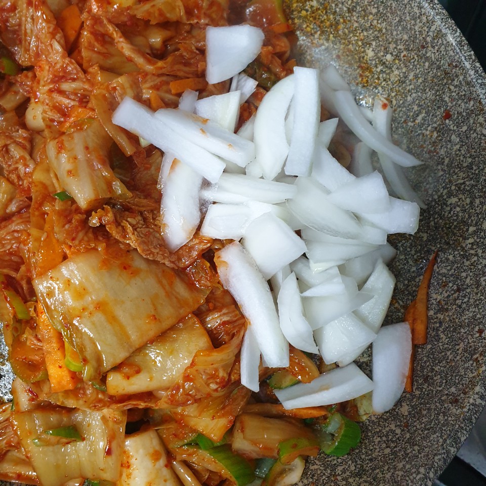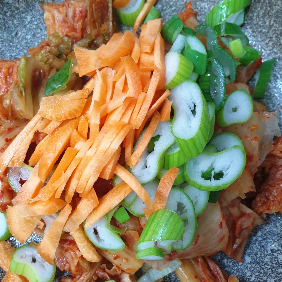 매운청량고추를 넣지 않고 아이랑 같이 먹으려고 고추가루도 넣지 않았구요 신김치만 있으면 금새 만드는