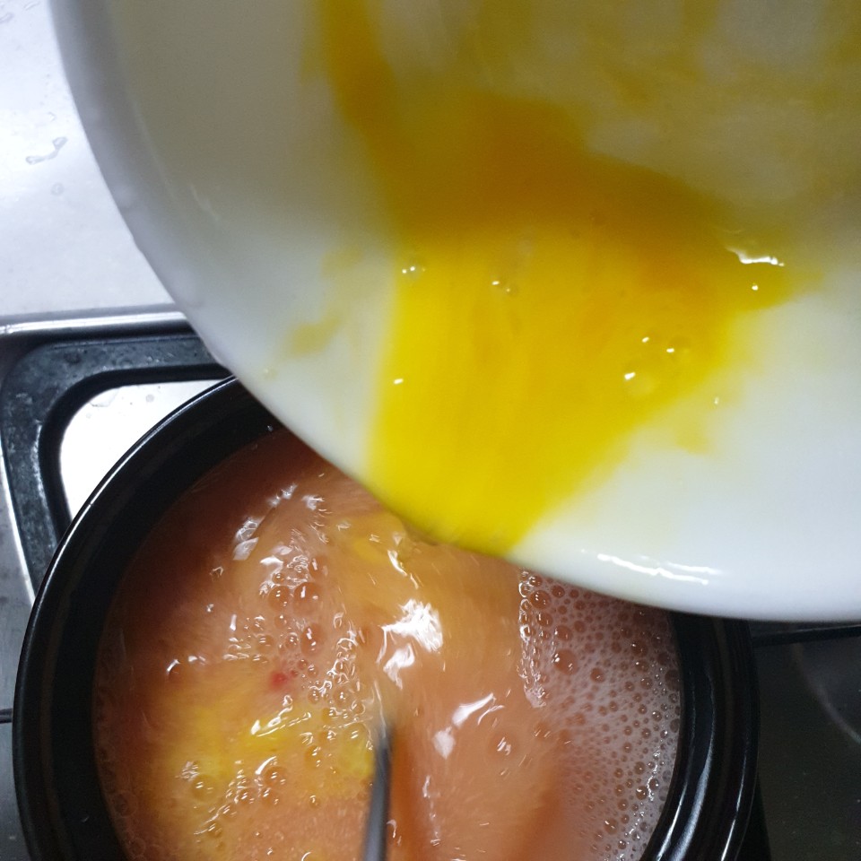 계란 두개를 풀어 같이 끓여줍니다. 미리 들어간 뜨거운물과 계란이 들어가면서 서로 익게 해줍니다.