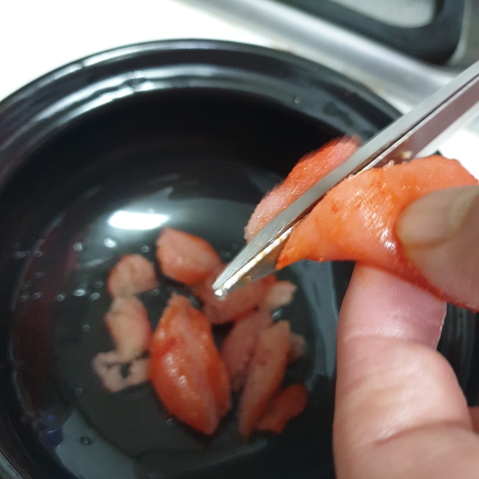 뚝배기에 명란알 두덩이를 가위로 촘촘하게 잘라줍니다.