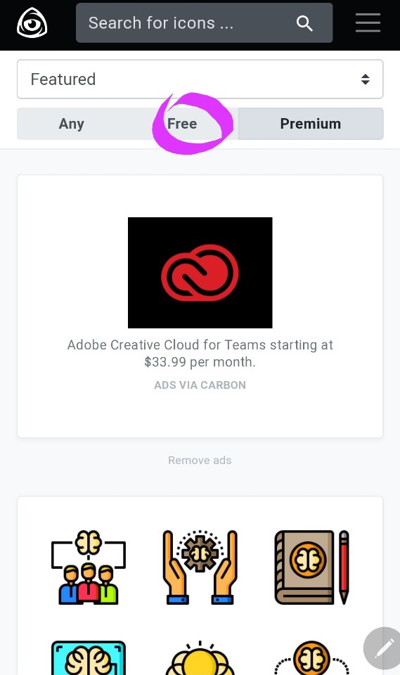 모바일 버전으로 사용하실때는 왼편에 view more를 눌러서 가운데 free를 눌러주시면 무료 아이콘을 찾아 보실수가 있답니다.