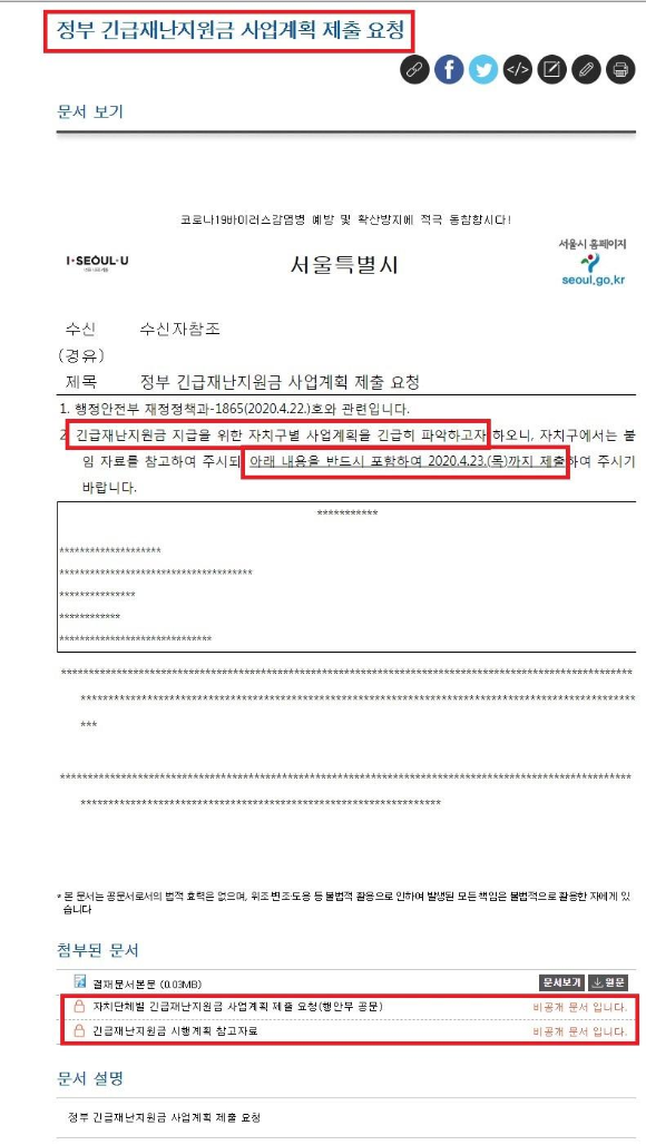행정안전부 재정정책과에서 서울시에게 정부 긴급재난지원금 사업계획 제출 요청 공문을 4월23일자로 보낸걸 확인했습니다.