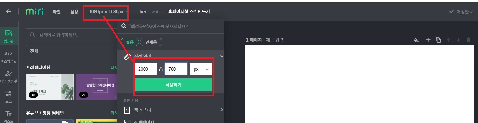 위의 미리캔버스를 열어 블로그 화면 사이즈를 입력해 주세요