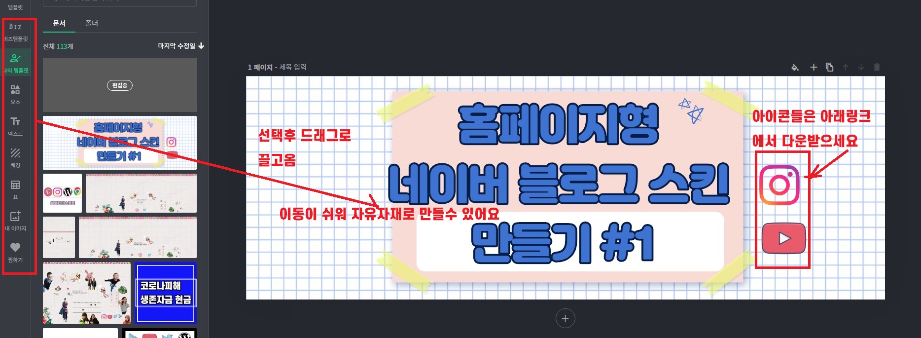 왼쪽에 있는 미리 만들어져 있는 템플릿을 드래그해서 가져와 배열해보세요