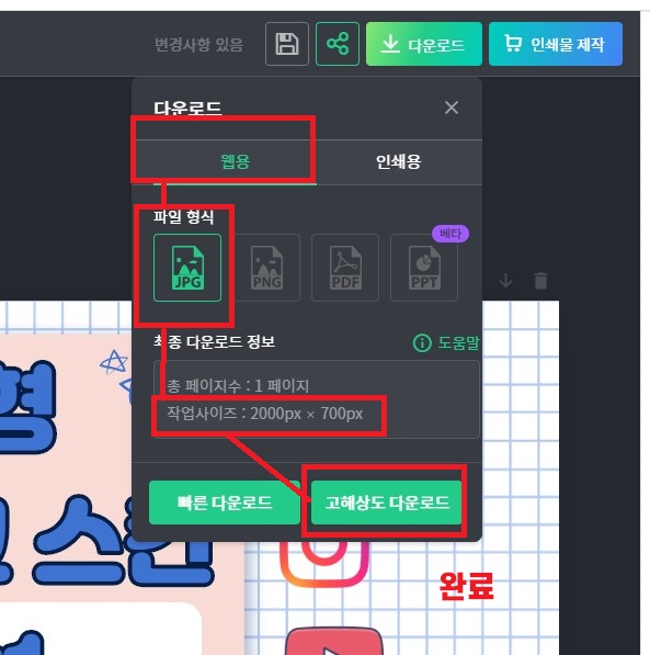 스킨설정이 완료 되었으면 웹용으로 JPG파일로 고해상도 다운로드를 받으세요