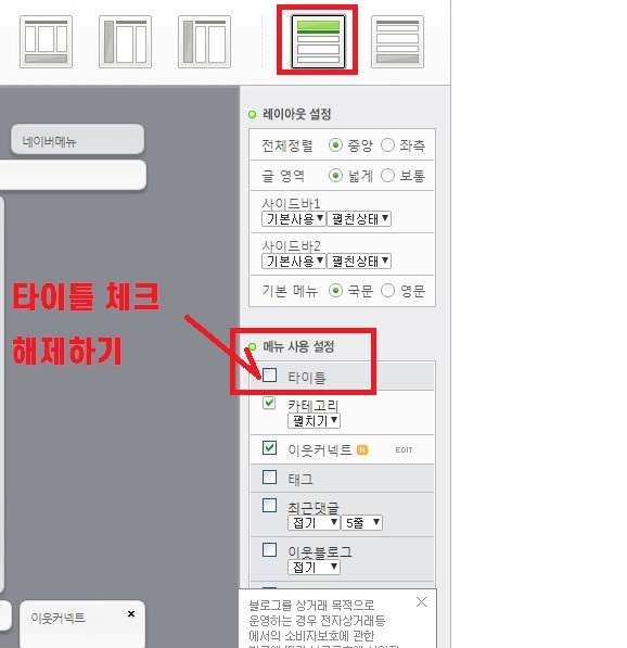 관리 > 꾸미기 설정> 레이아웃설정으로가 아래 타이틀에 체크를 해제해주세요
