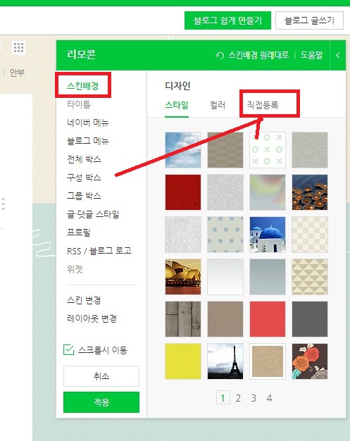스킨배경에 젤오른쪽 직접등록을 눌러 주세요. 세부디자인 설정을 클릭해 주세요.
