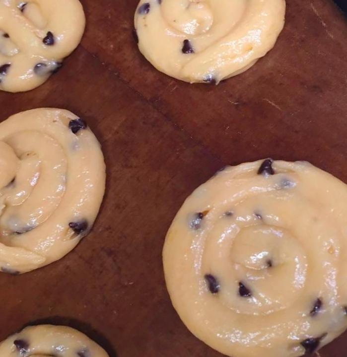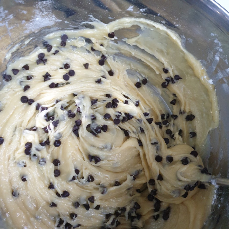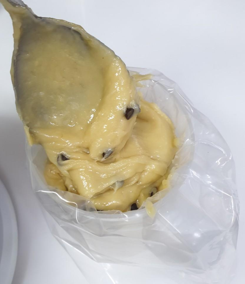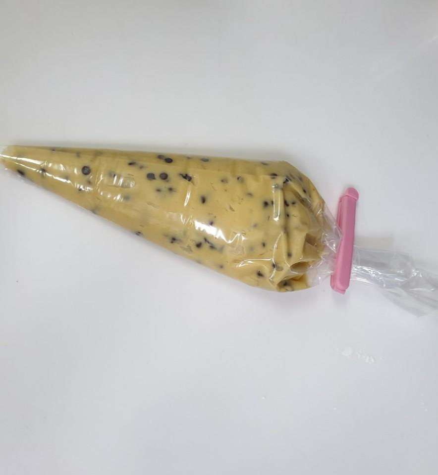 반죽이 생각보다 질게 되서 짤주머니를 이용해서 짜보도록 하겠습니다. 초코칩도 짤주머니에 걸릴까봐 반만넣고 나머지는 장식해주겠습니다.