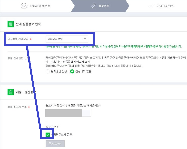 어떤 카테고리에서 판매를 하실지 선택하는 겁니다. 해당카테고리 체크해주세요 저는 출고지주소 사업장주소와 동일을 체크했습니다.