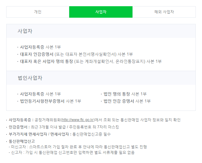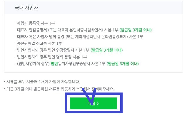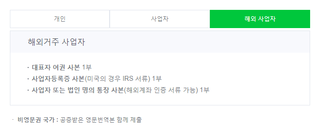 국내 사업자일 경우 필요한 서류를 모두 확인하고 다음으로 넘어갑니다. 저는 대표자 인감증명은 핸드폰인증으로 할꺼라서 인감증명서는 패스합니다.