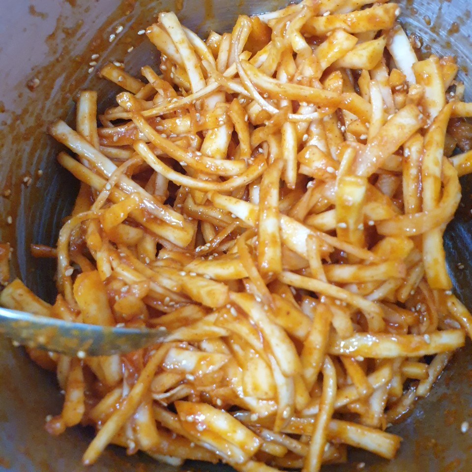 양념장은 초고추장으로 간편하게 하시면 되는데 다진마늘 반숟가락을 넣고버무리다가 물엿이나 올리고당을 넣어주시고 통깨를 뿌려 그릇에 담고 마무리 해주시면 완성입니다. 양파를 추가해주셔도 맛있답니다.
