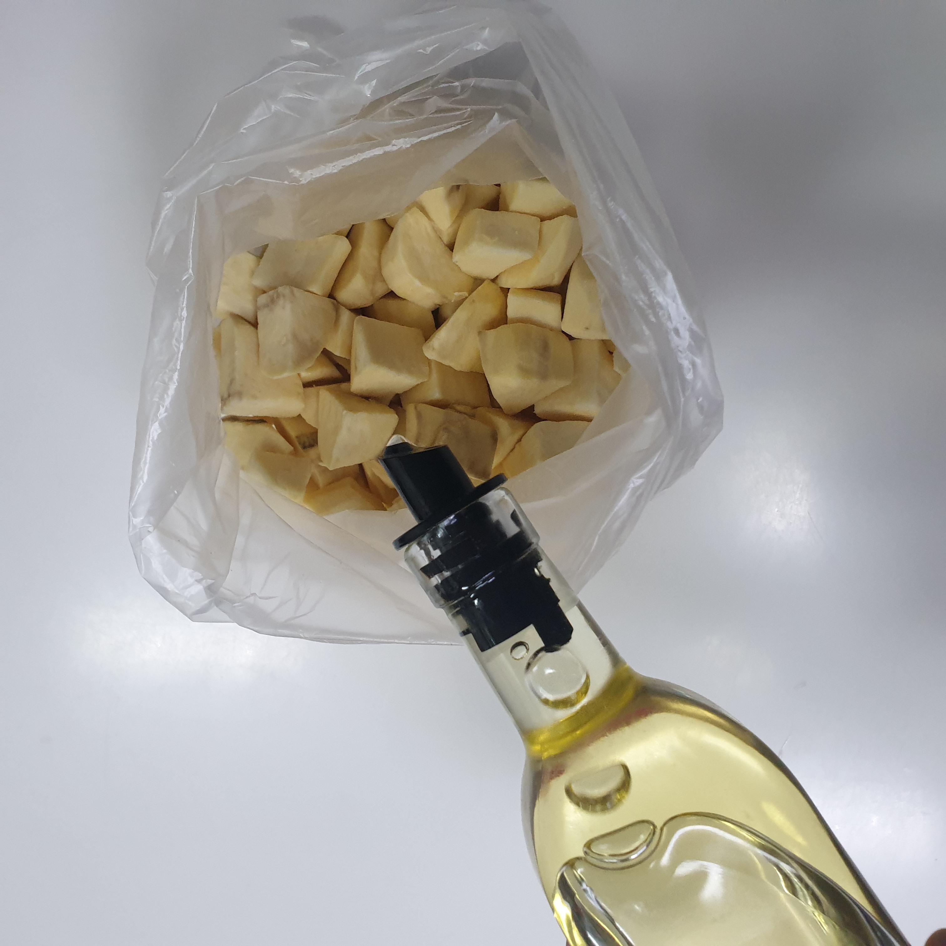 4.물기를 제거한 고구마를 비닐봉투에 담고 오일을 뿌려준다