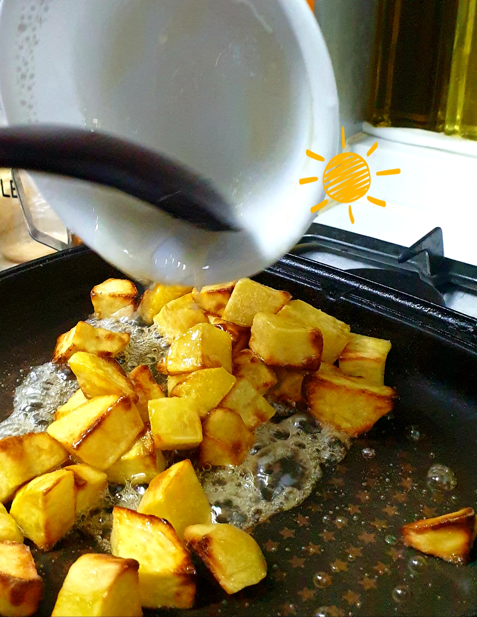 7.후라이팬에 물 2숟가락 설탕2숟가락을 넣고 젓지않은 상태에서 설탕물이 끓어 오르면 재빠르게 고구마를 넣고 버무린다