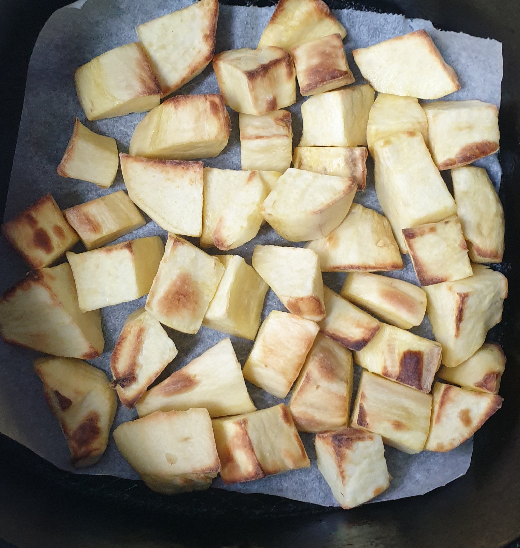6.에어후라이기에 고구마를 담고 190도 에 10분 뒤집어서 170도에 7분간 돌려준다