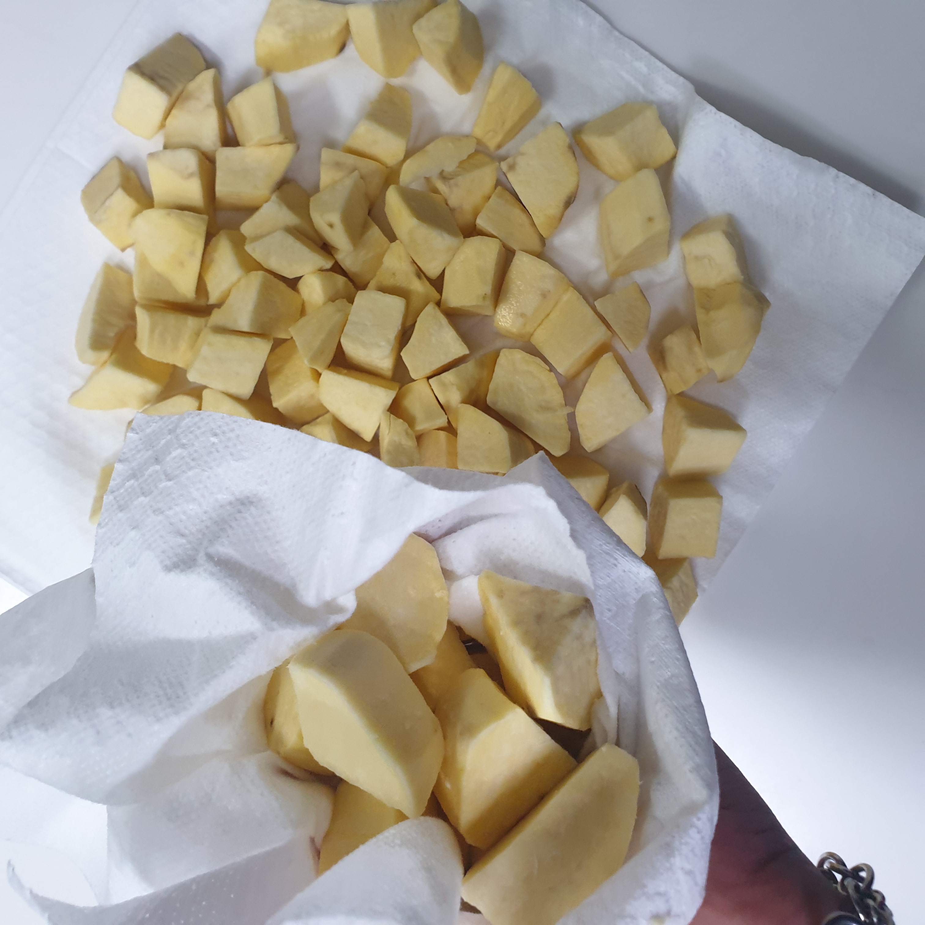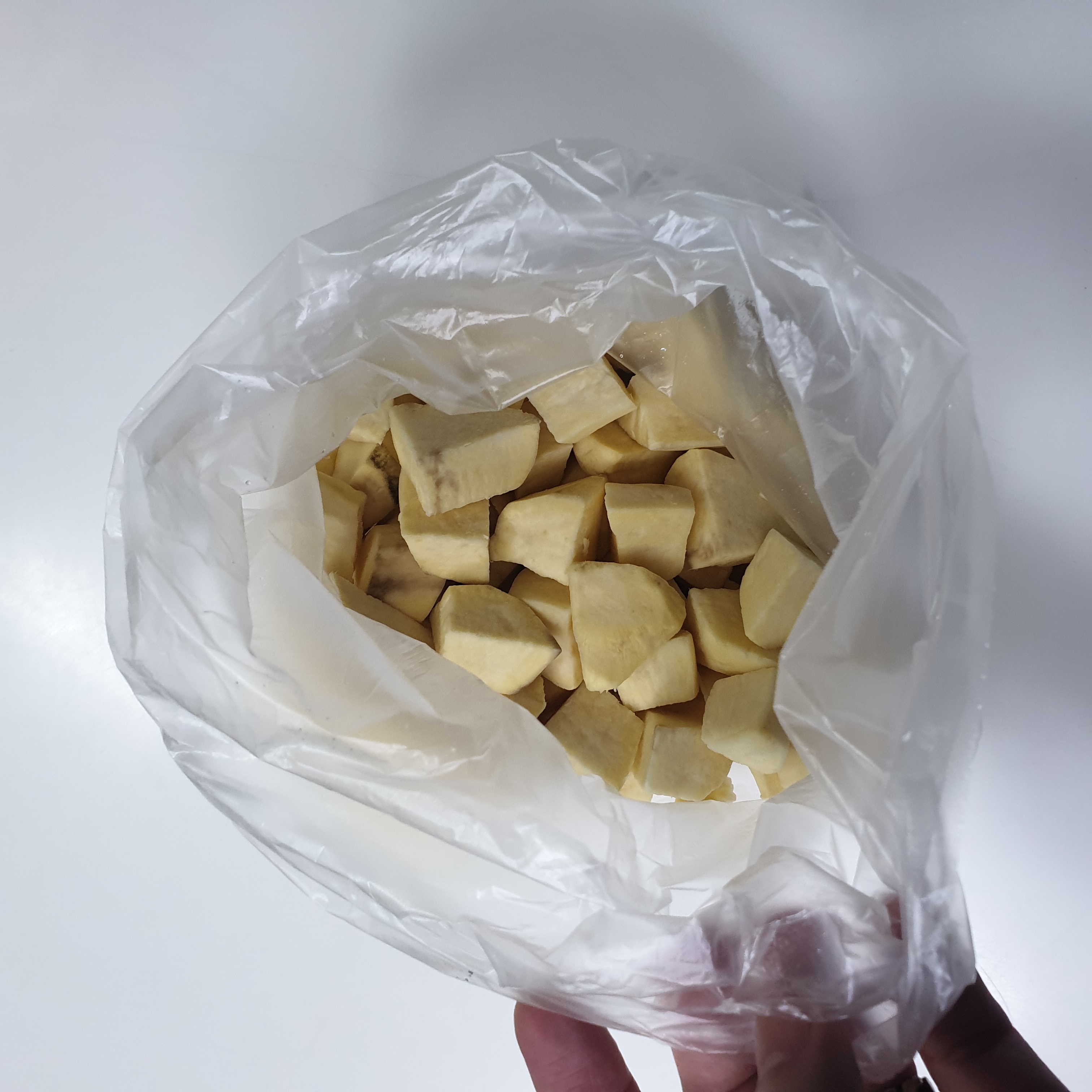 3.전분을 제거한후 키친타올에 고구마의 물기를 꼼꼼히 닦아 비닐에 담습니다