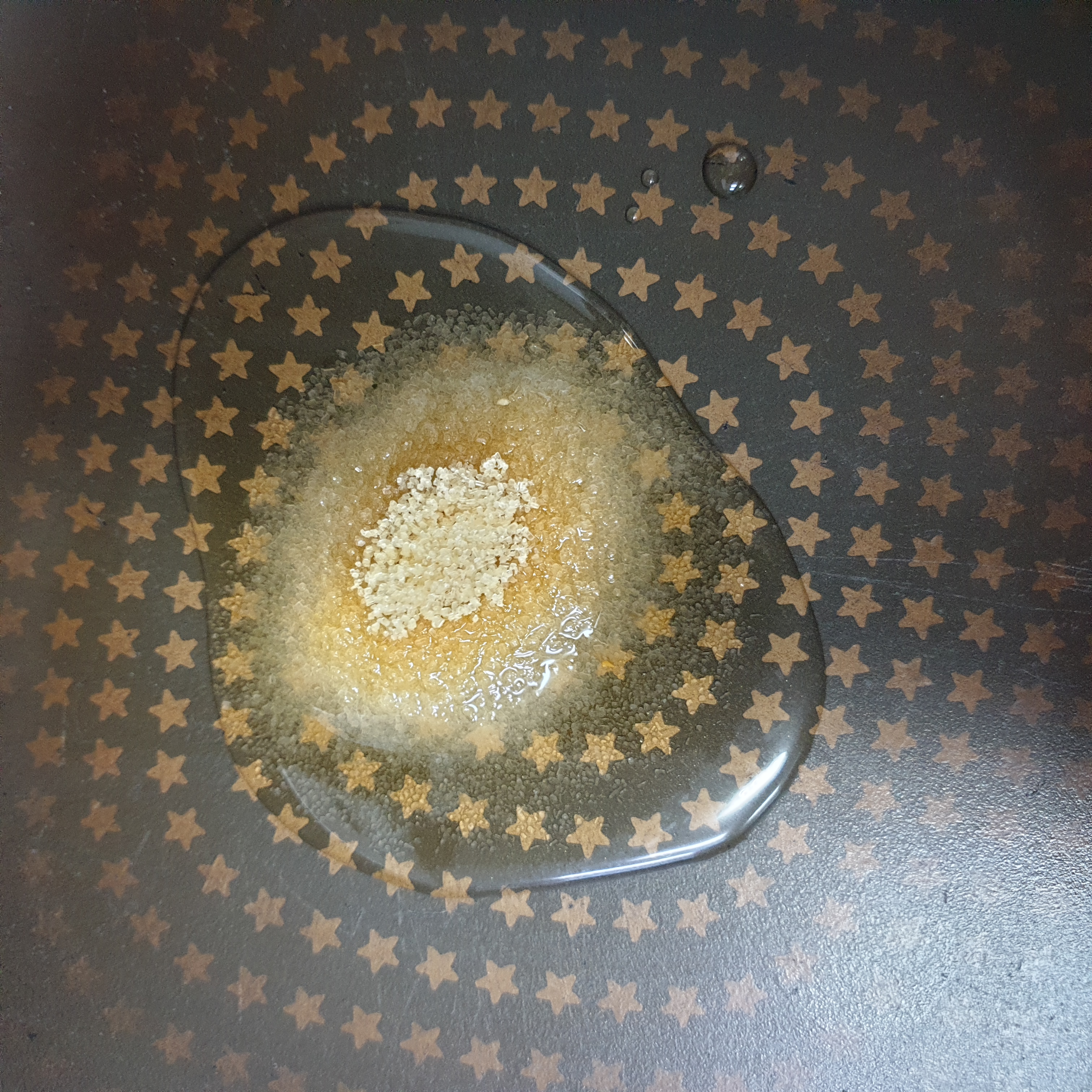 후라이팬에 물2스푼 설탕2스푼을 넣고 젓지않고 끓어 오를때까지 잠깐기다린다