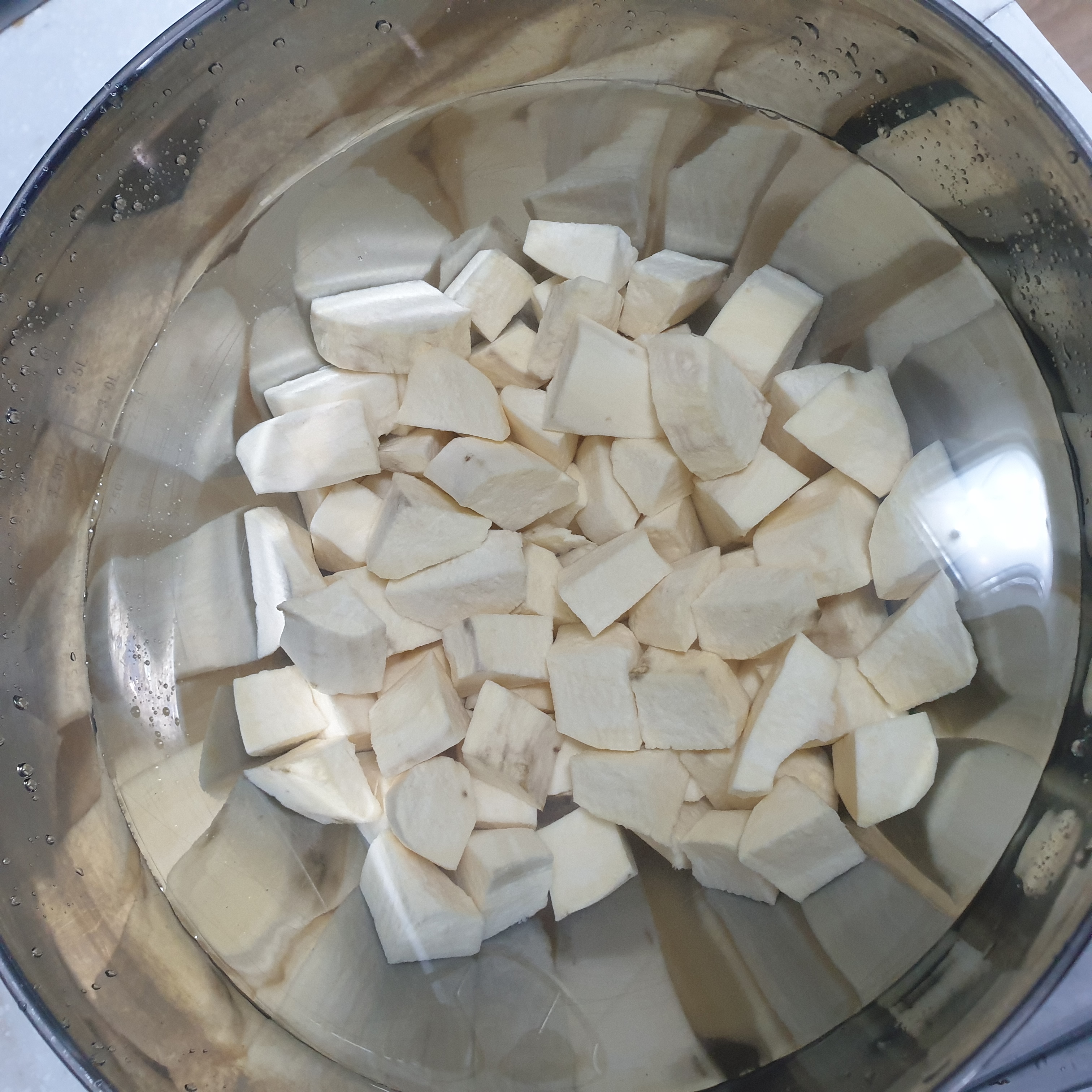 2.고구마를 한입크기로 깍뚝썰기를 해서 찬물에 10~15분정도 담궈 전분을 제거한다