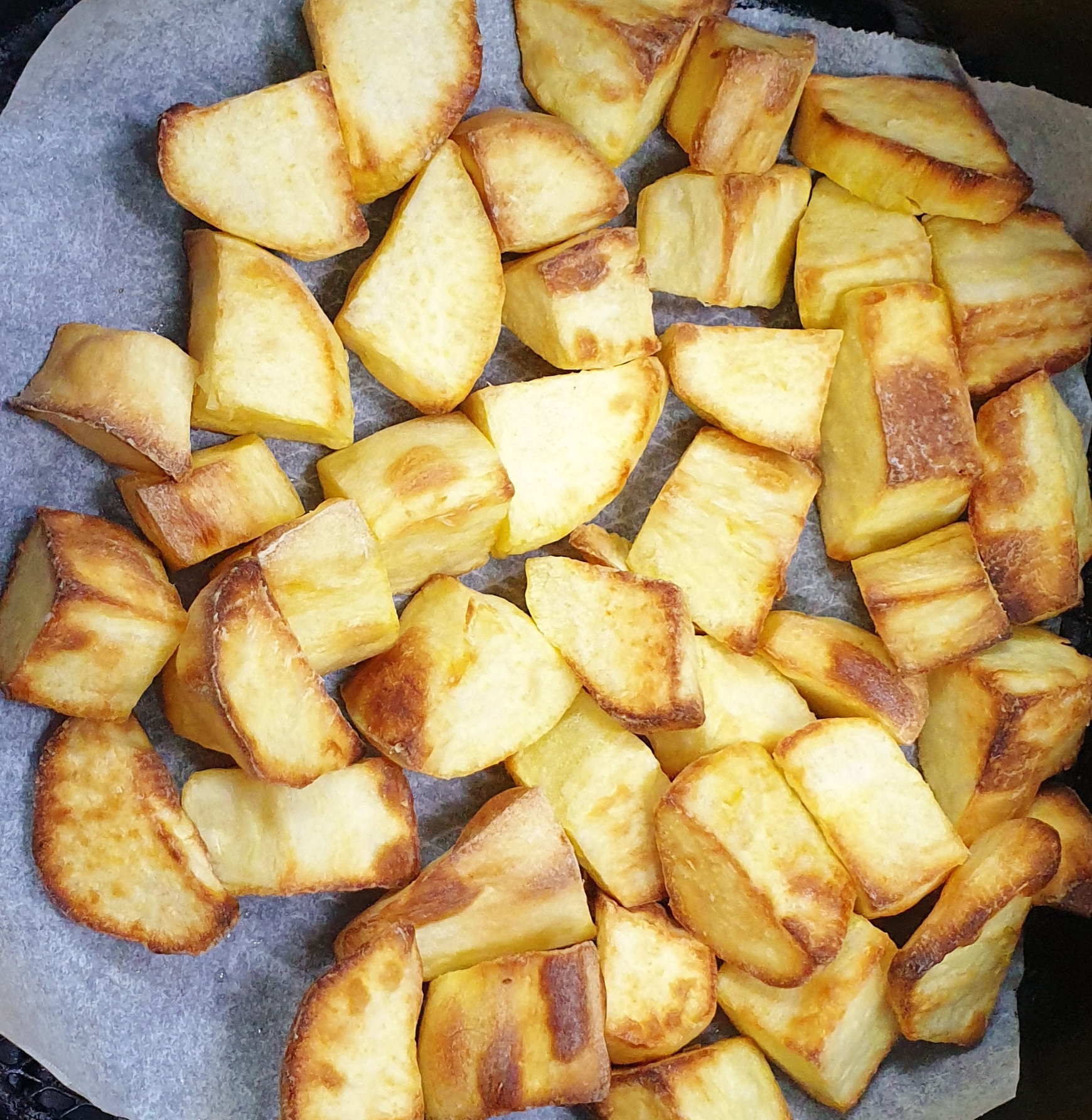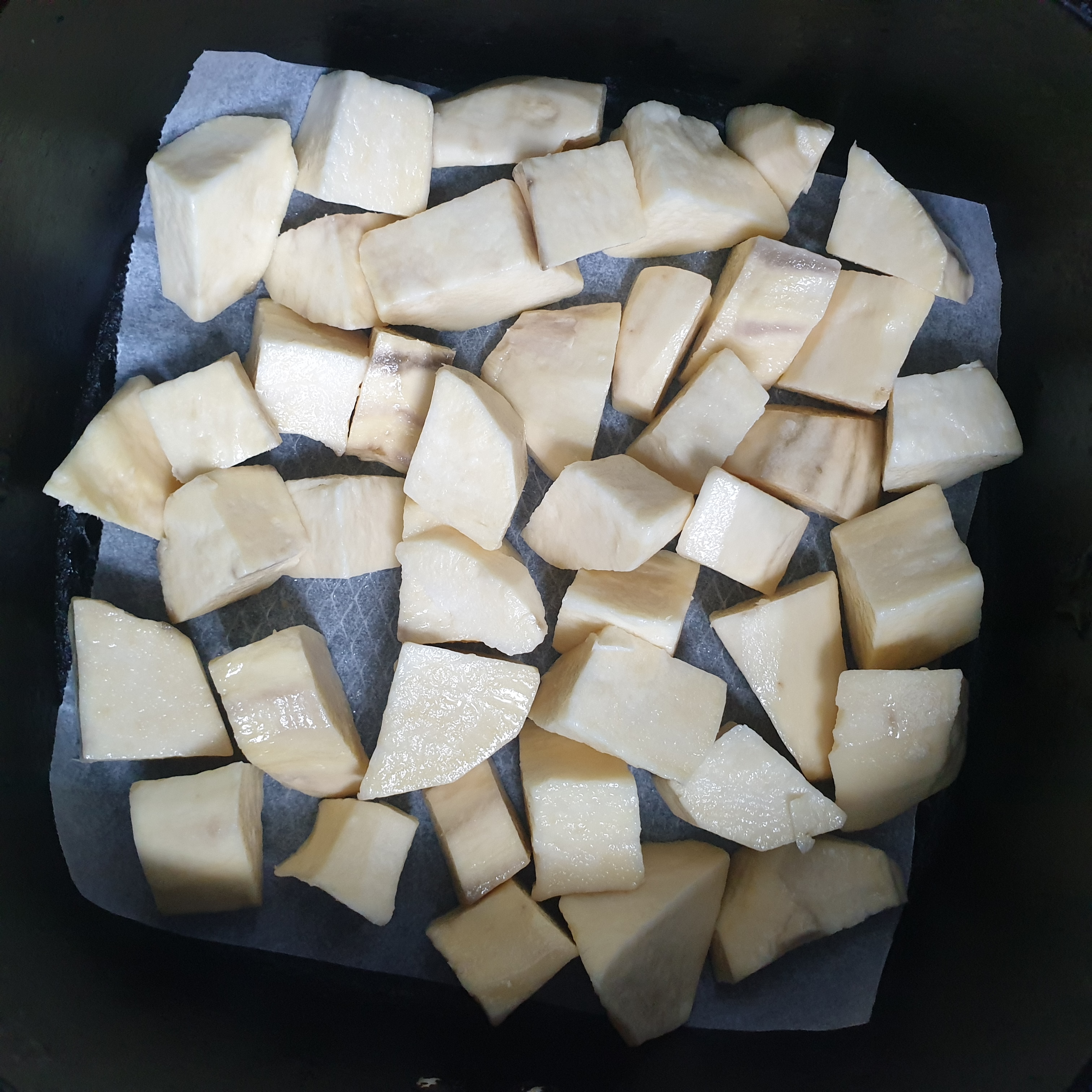 6.고구마를 에어후라이에 담고 190도에서 10분 뒤집어서 170도에서 7분간 튀겨준다