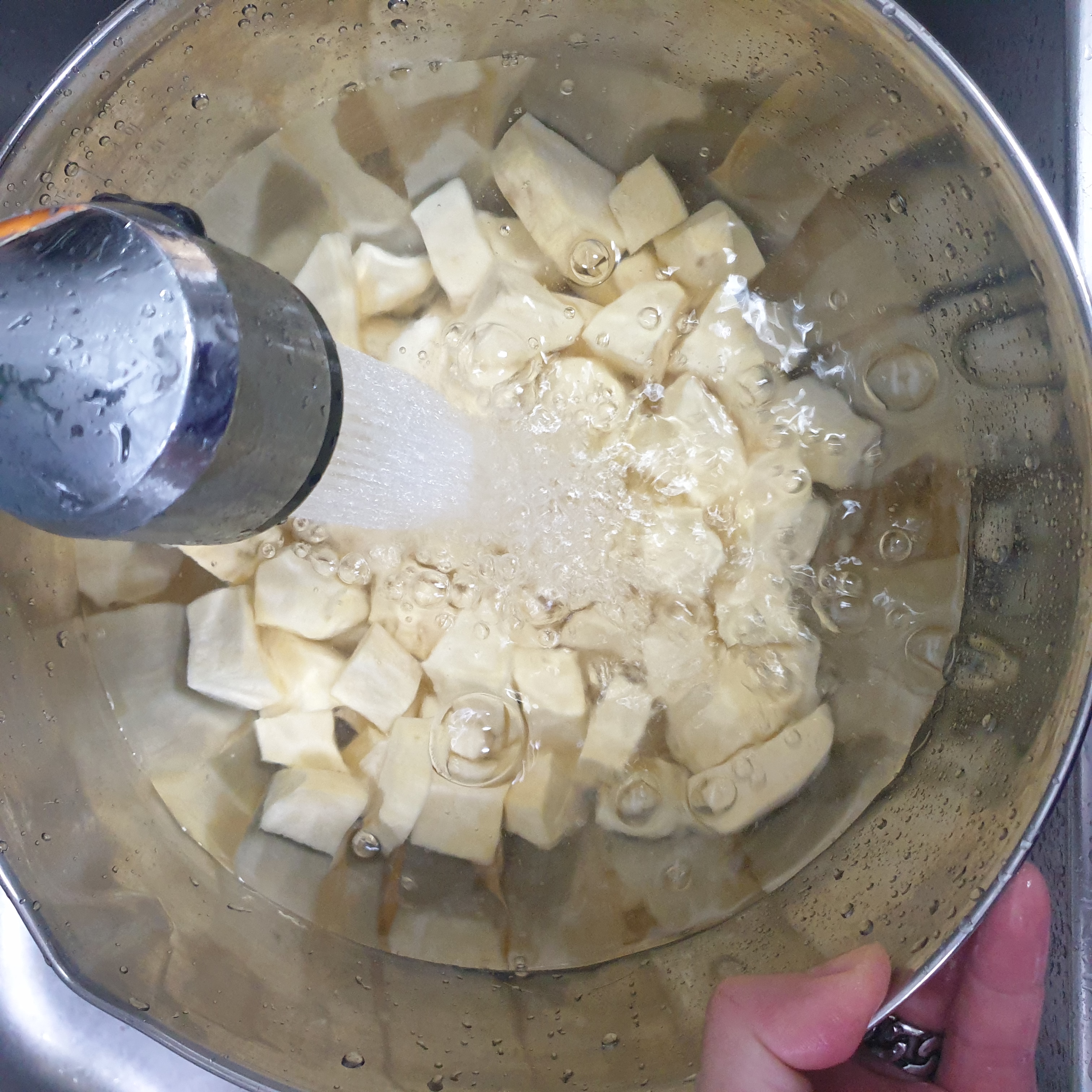 8.끓어오르면 익힌고구마를 넉고 재빠를게 버무린다