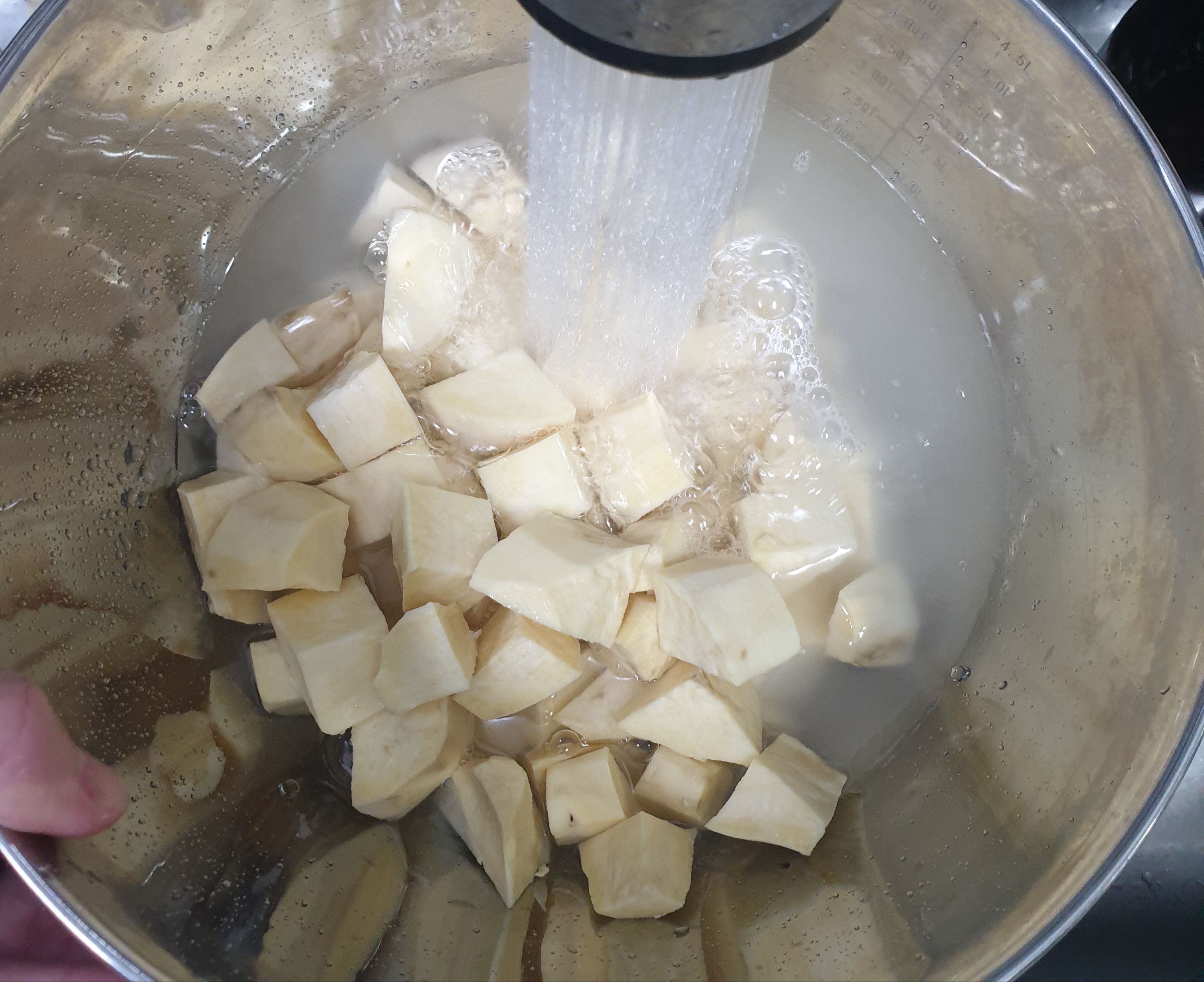 2.깍뚝썰기를 해서 차가운물에 전분을 제거해줍니다 (10~15분정도)
