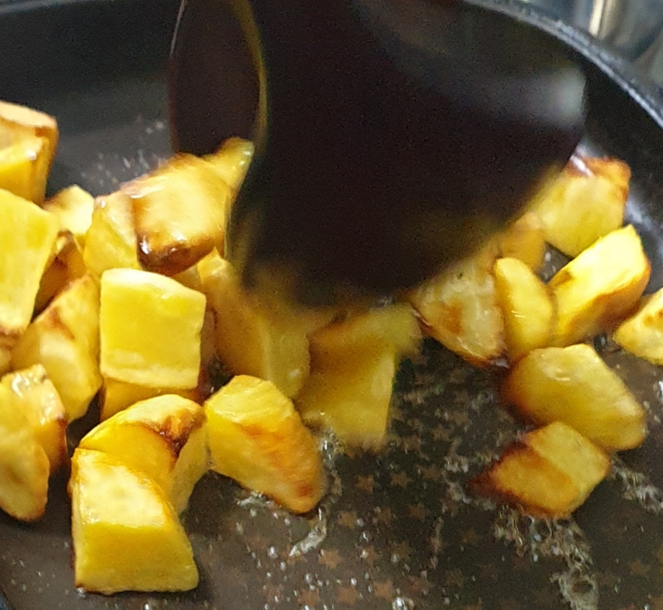 8.고구마 전체가 설탕시럽이 살짝 뭍혀졌을때 물엿이나 올리고당 4숟가락을 넣고 재빠르게 버무린다