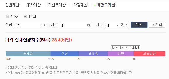 임의로 체중과 나이를 적어봤는데 54때 85kg 이면 비만이라고 나옵니다.