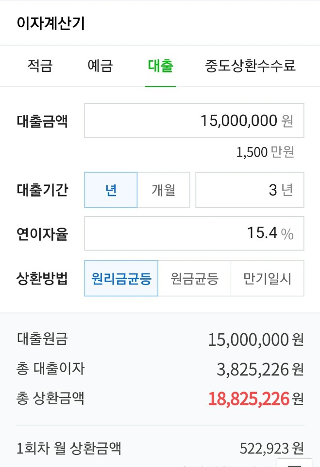 대출금이 15000000원이 나온다고 가정할 경우 3년만기 연이자율 15.4% 이고 원리금균등이라고 설정을 해보겠습니다.