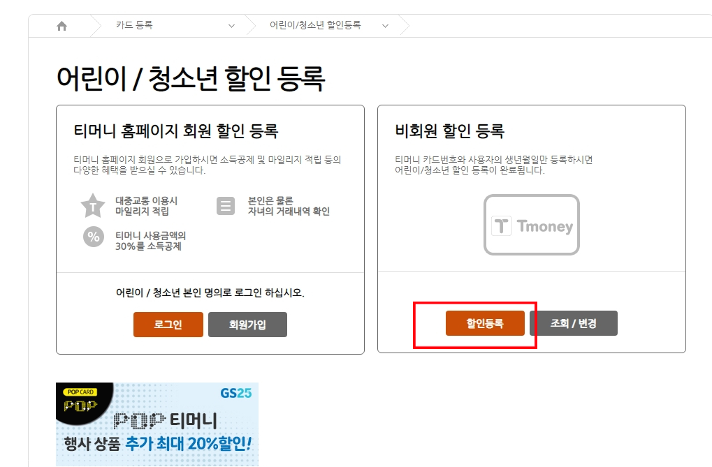 이렇게 어린이/청소년 할인등록이 보이는데요
