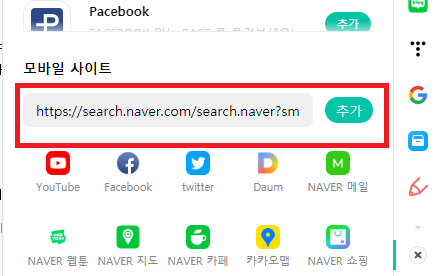 주소입력은 검색창위에 바로가기 링크를 전부다 복사해서 그대로 오른쪽 모바일사이트 주소입력창에 넣고 추가를 넣으시면 된답니다.