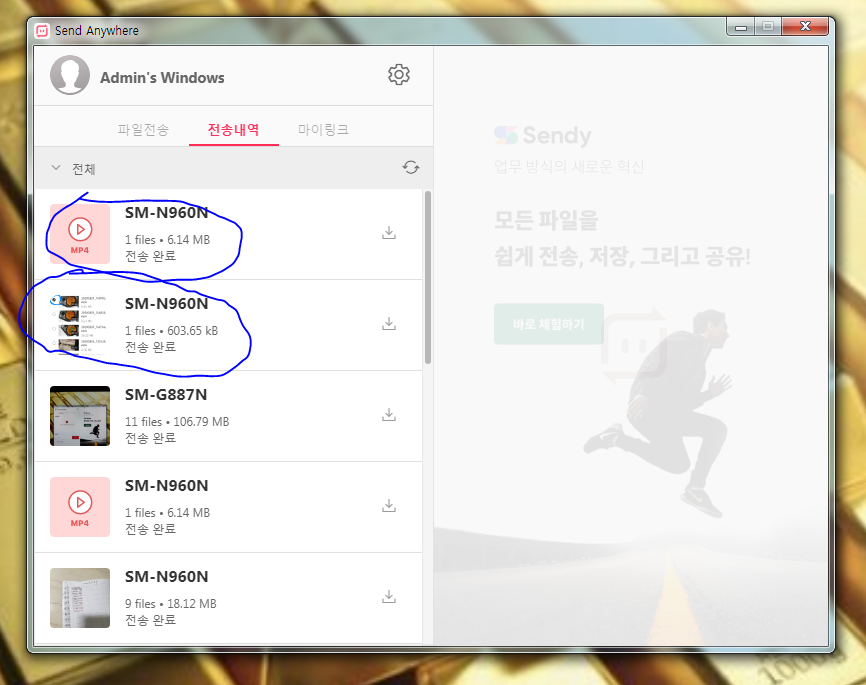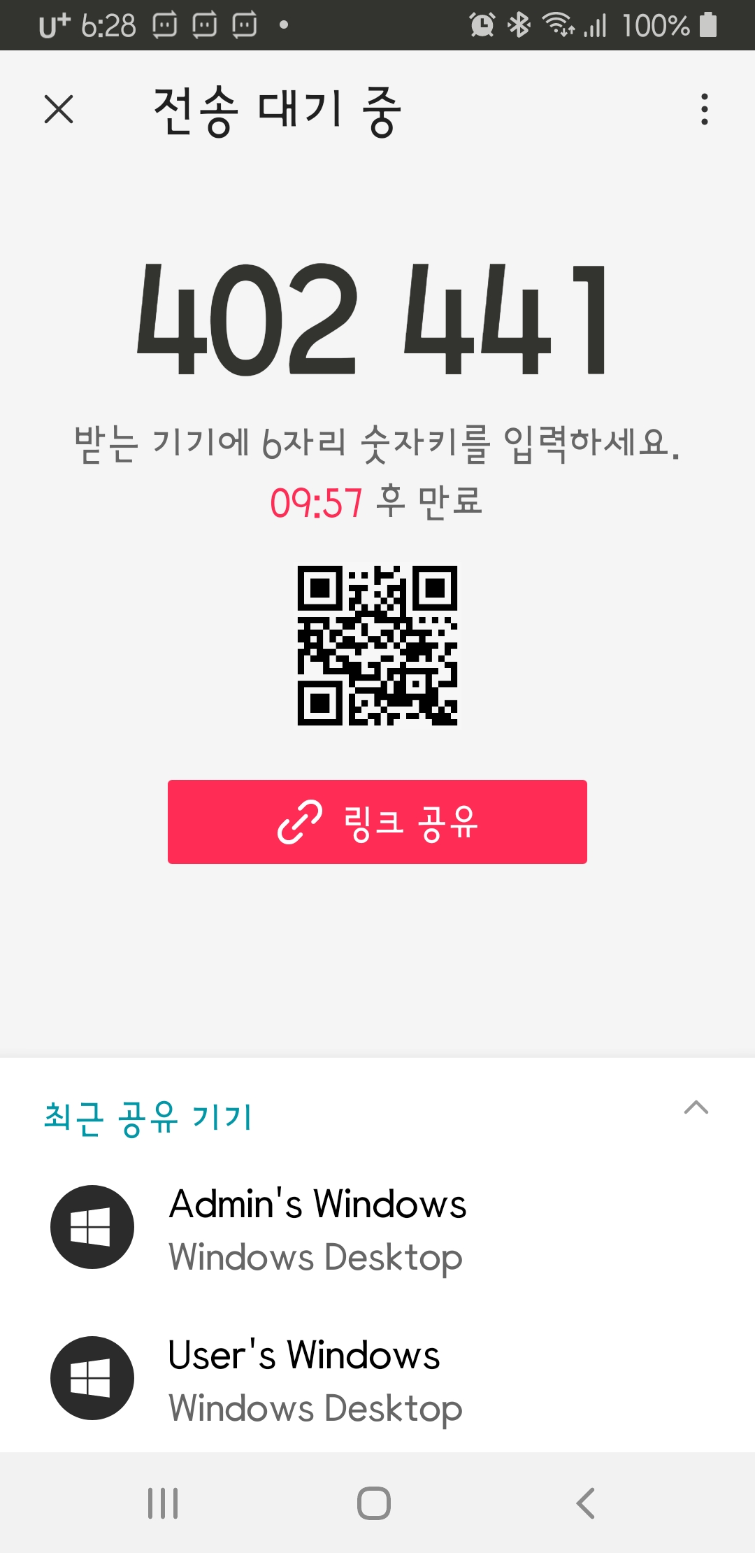 핸드폰에서 전송이 완료되면 아래처럼 이렇게 나와요