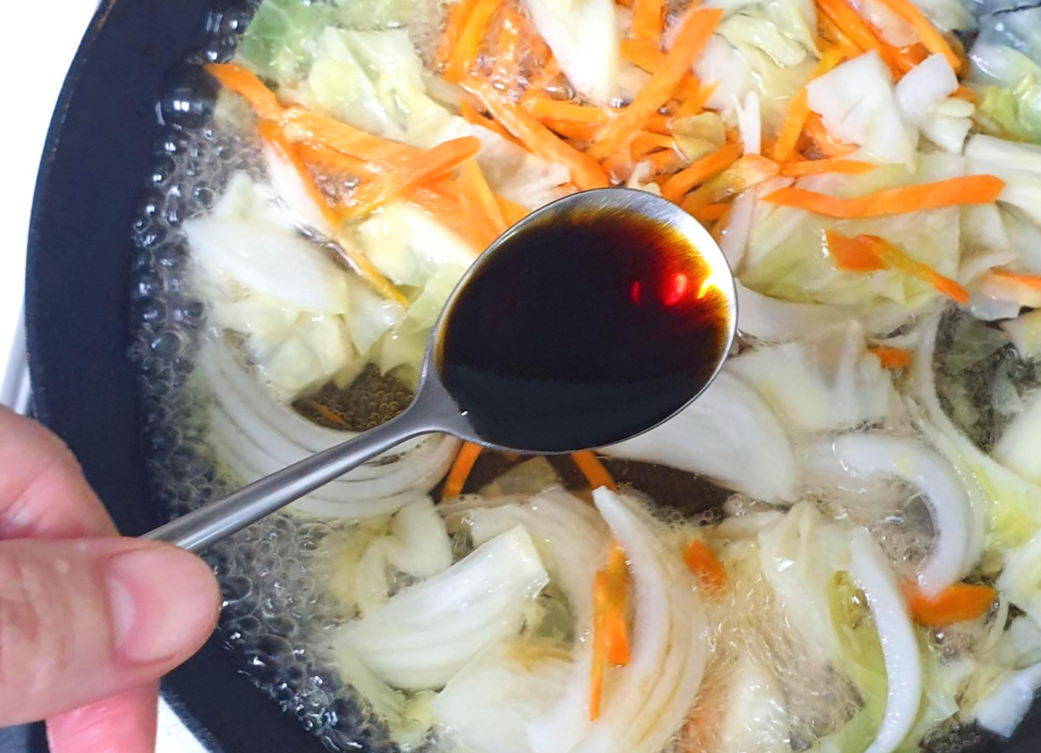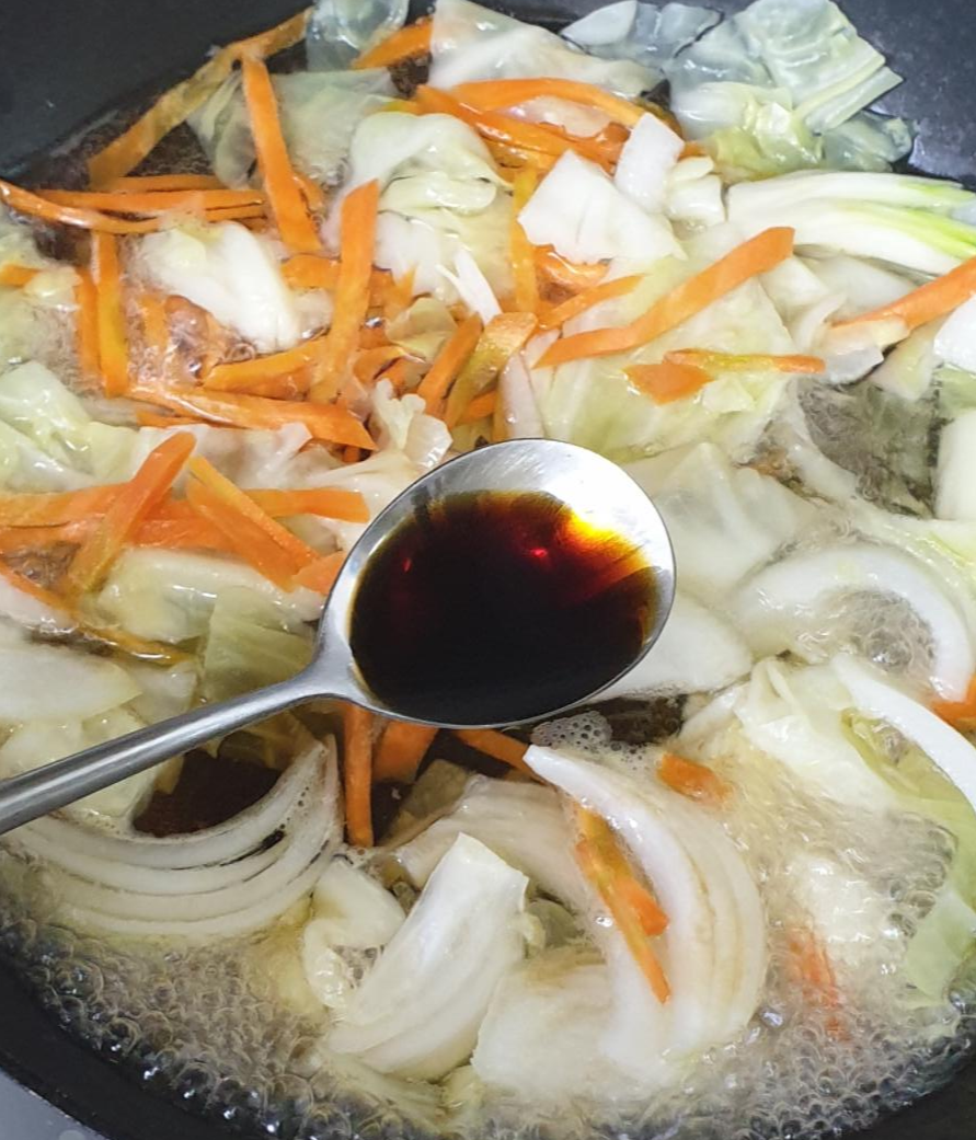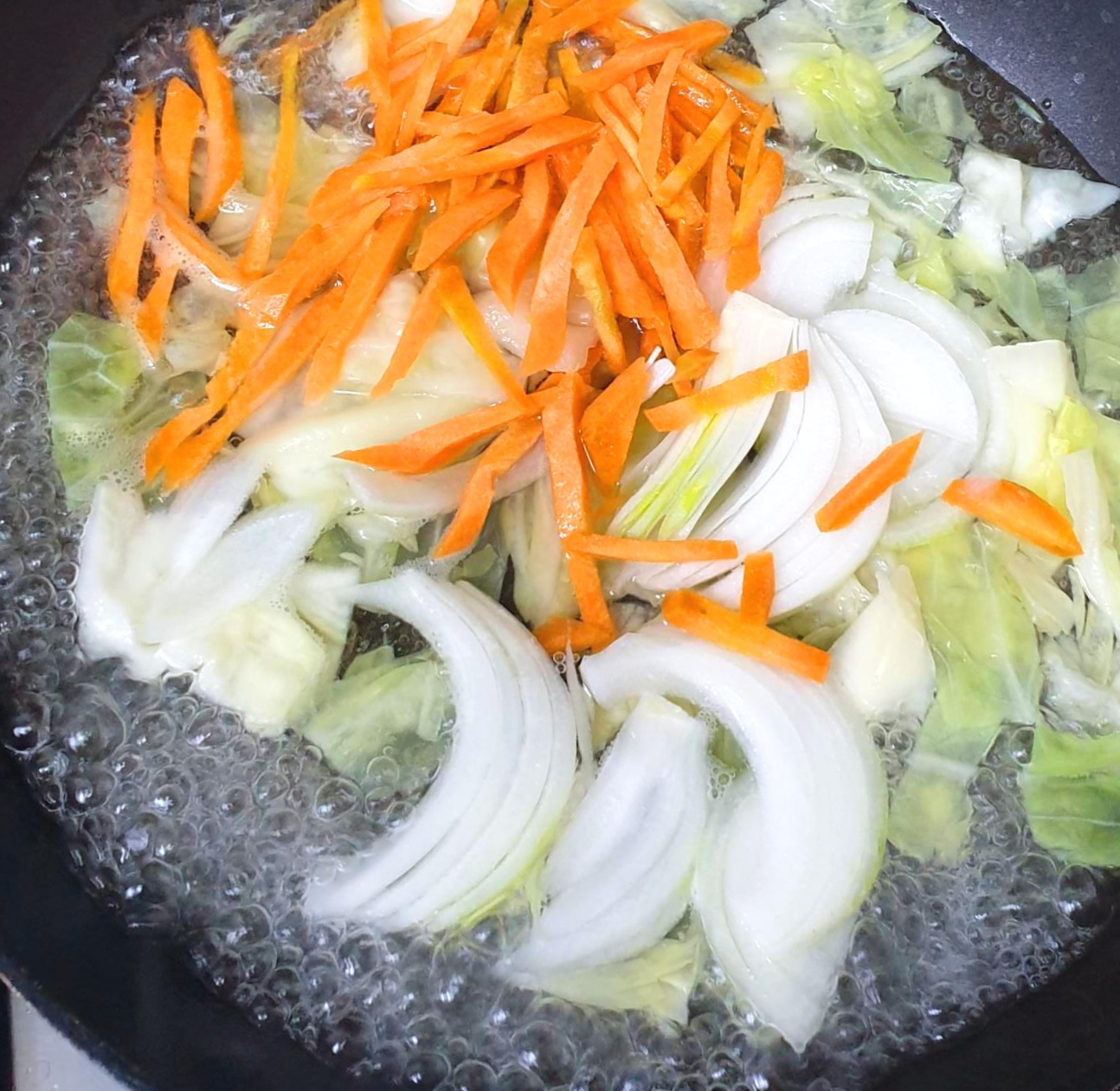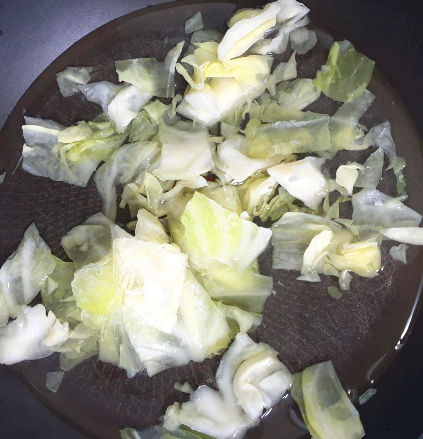 2.후라이팬에 양배추를 넣고 살짝 잠길만큼 물을 넣고 끓입니다.