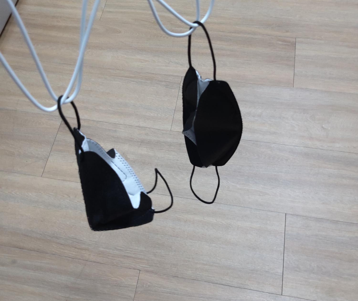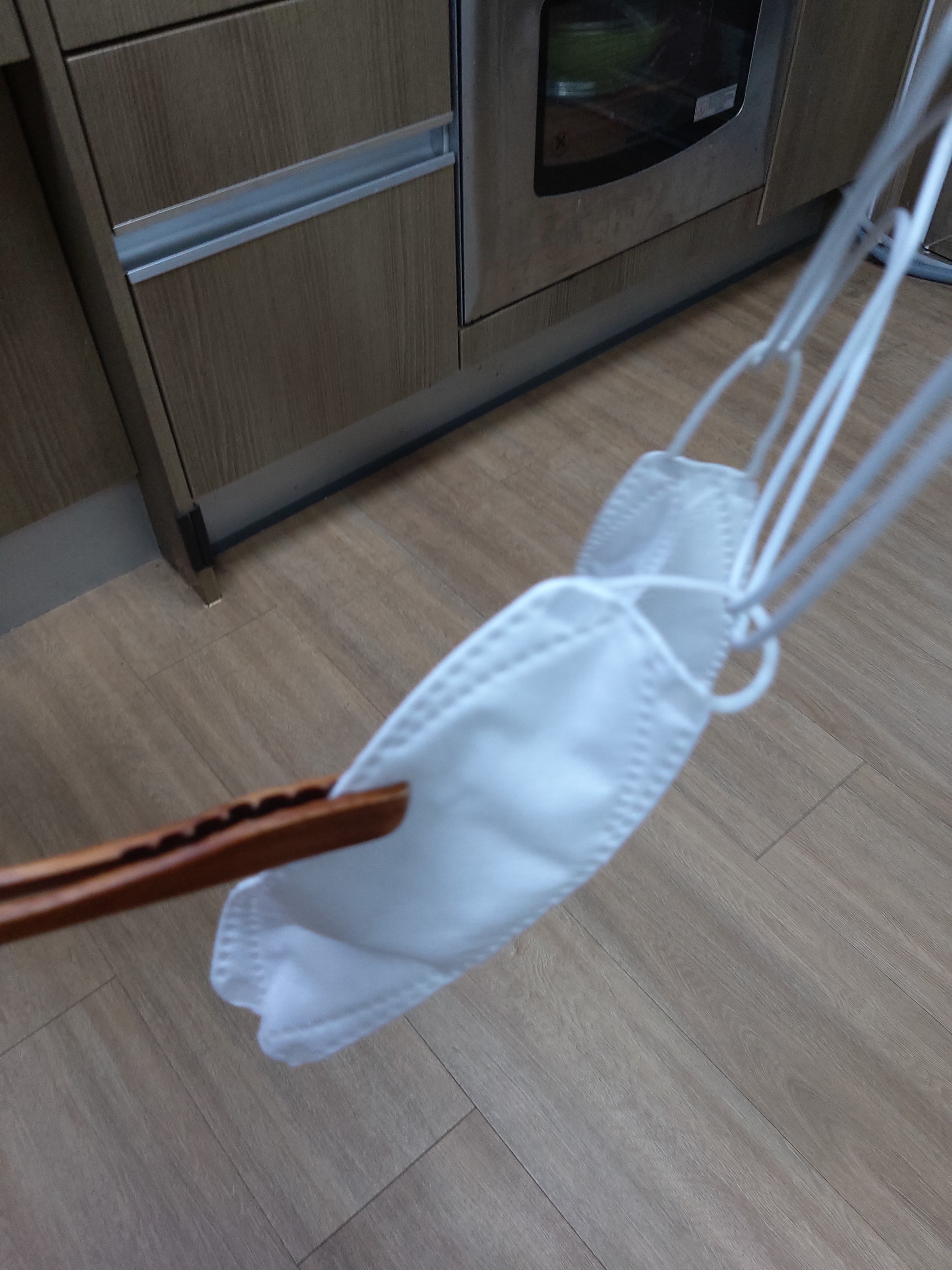 이렇게 수증기열로 소독을 마치고 잘닦아놓은 세탁소 옷걸이에 사이좋게 4개의 마스크를 걸어놓으니