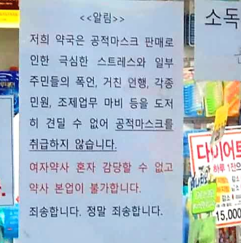 안타까운소식이 있었습니다 그후론 여약사님께서는 마스크 판매를 안하시겠다고 약국앞에 마스크 판매불가를 써붙혀놨