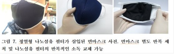 우리가 사용하는 일반적인 미세먼지 황사마스크는 섬유필터의 정전기방식을 이용하여 외부 미세먼지의 유입을 마스크로 부터 호흡기로 들어오지 못하도록 막아주는 기능이였는데 반해 물이나 수분등이 닿게되면 정전기 기능이 사라지게되어 다시 사용하는것이 불가능했습니다 그부분을 해소시켜줄수 있는 나노마스크는세계최초로 카이스트 김일두교수 연구팀의 결과로 나노섬유필터로 세척후에도 한달동안쓸수 있도록 개발이 되어 틍허등록을 마친상태라고 합니다. 현재는 대전 캠퍼스 안에 생산할수 있는 설비를 갖추고 있으며 하루의 생산량이 늘어남에 따라 생산설비를 늘려가고 있다고 합니다