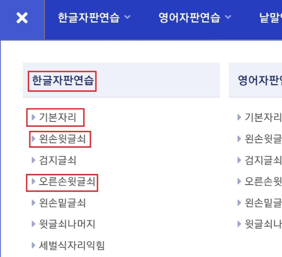 최상단 왼쪽에 한글자판연습을 누르시고 기본자리부터 연습하시면 됩니다