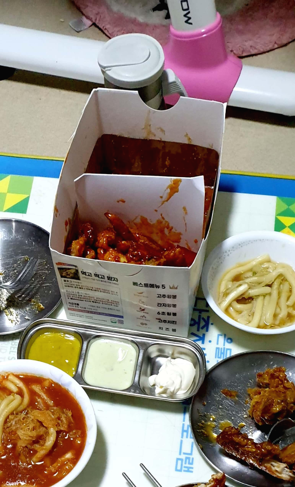 아이들이 배고파해서 떡뽁이도 같이 만들어 줬는데 그건 안먹고 간장소스 간지치킨만 다먹었네요