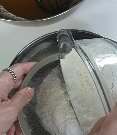 4.계란과 식물성오일 설탕을 썩어 놓은뒤 다른볼에다 밀가루를 체에 곱게 쳐줍니다
