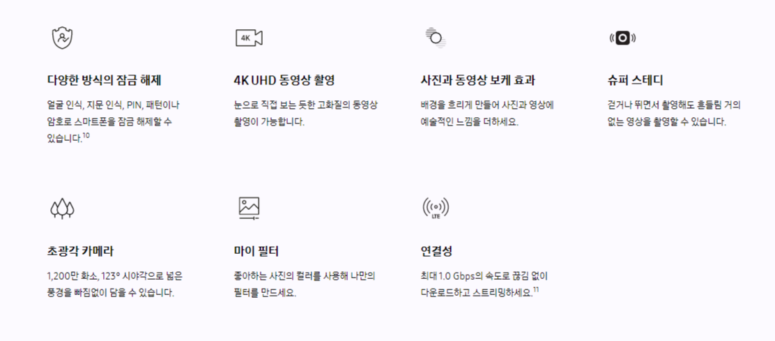 전면카메라의 경우 1000만화소 F2.4지원