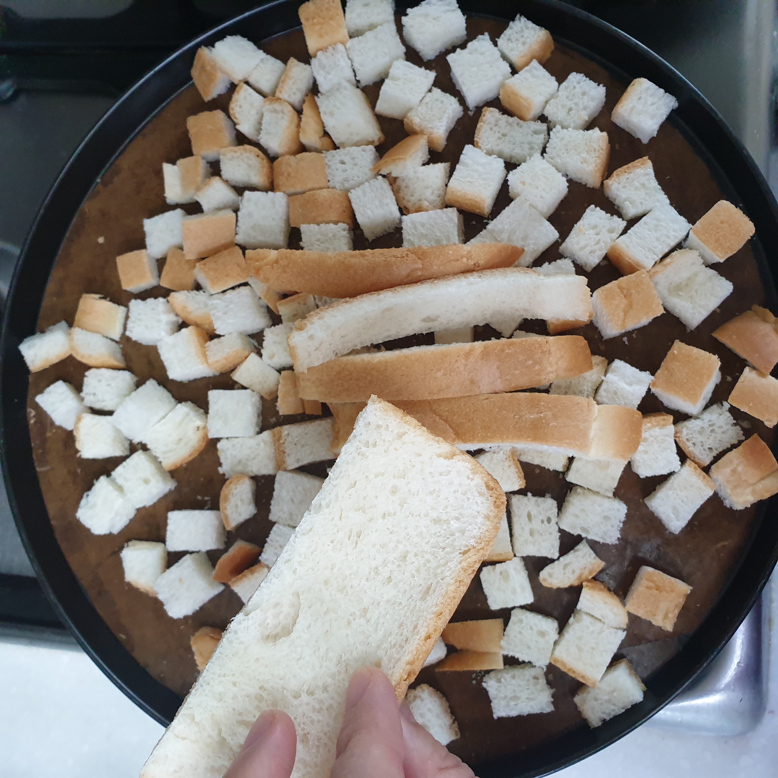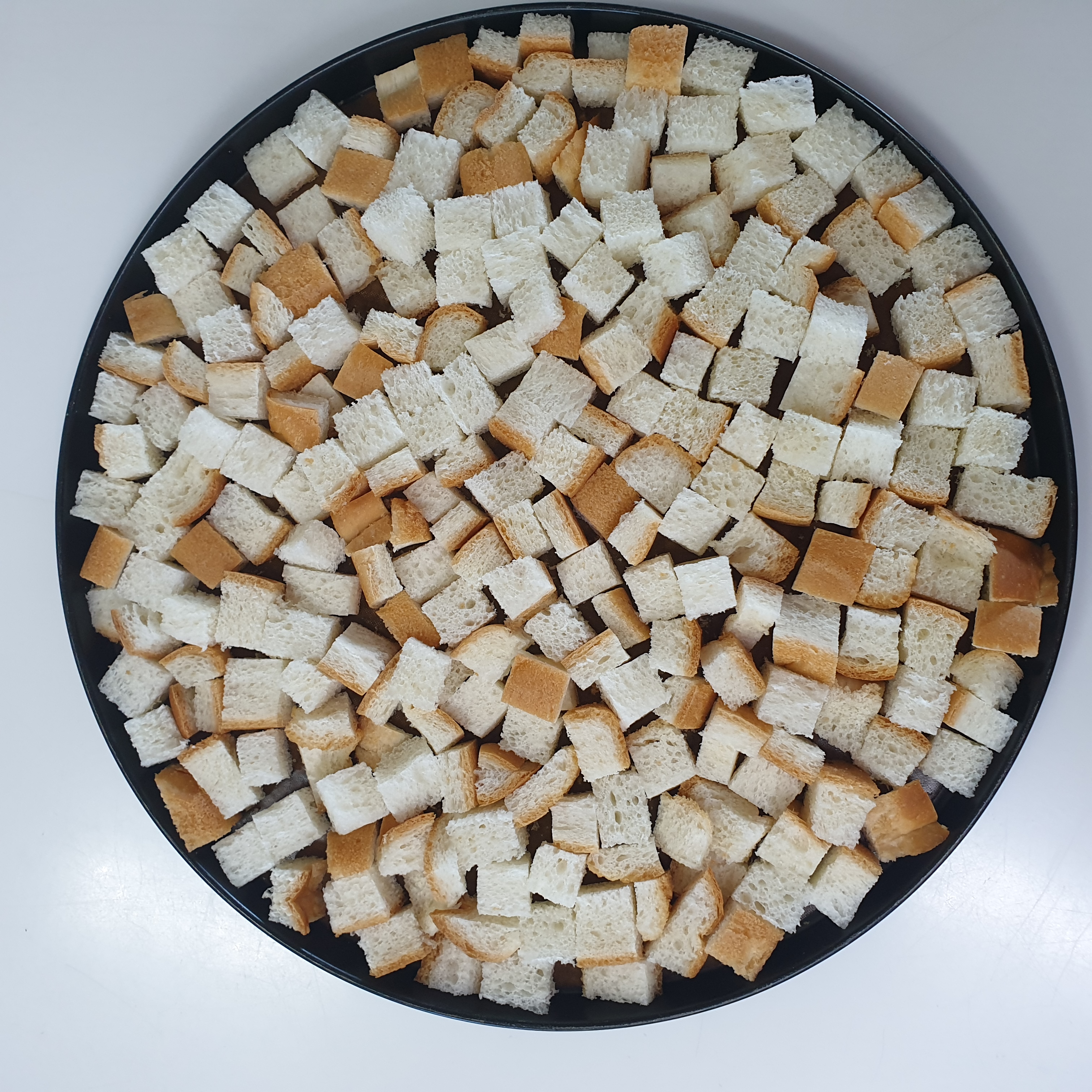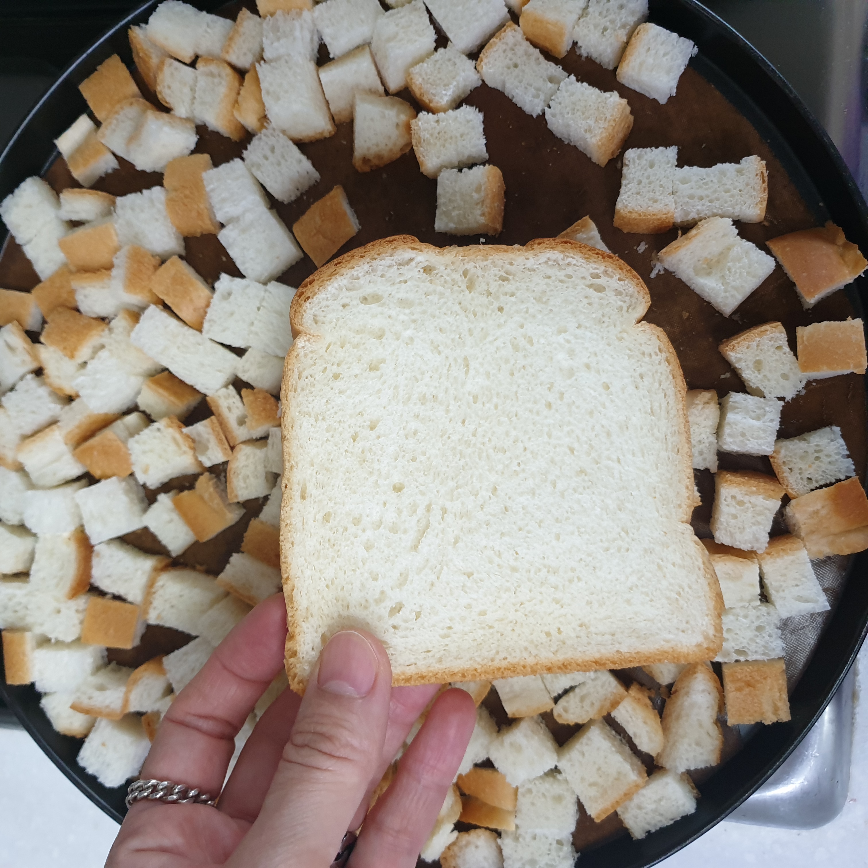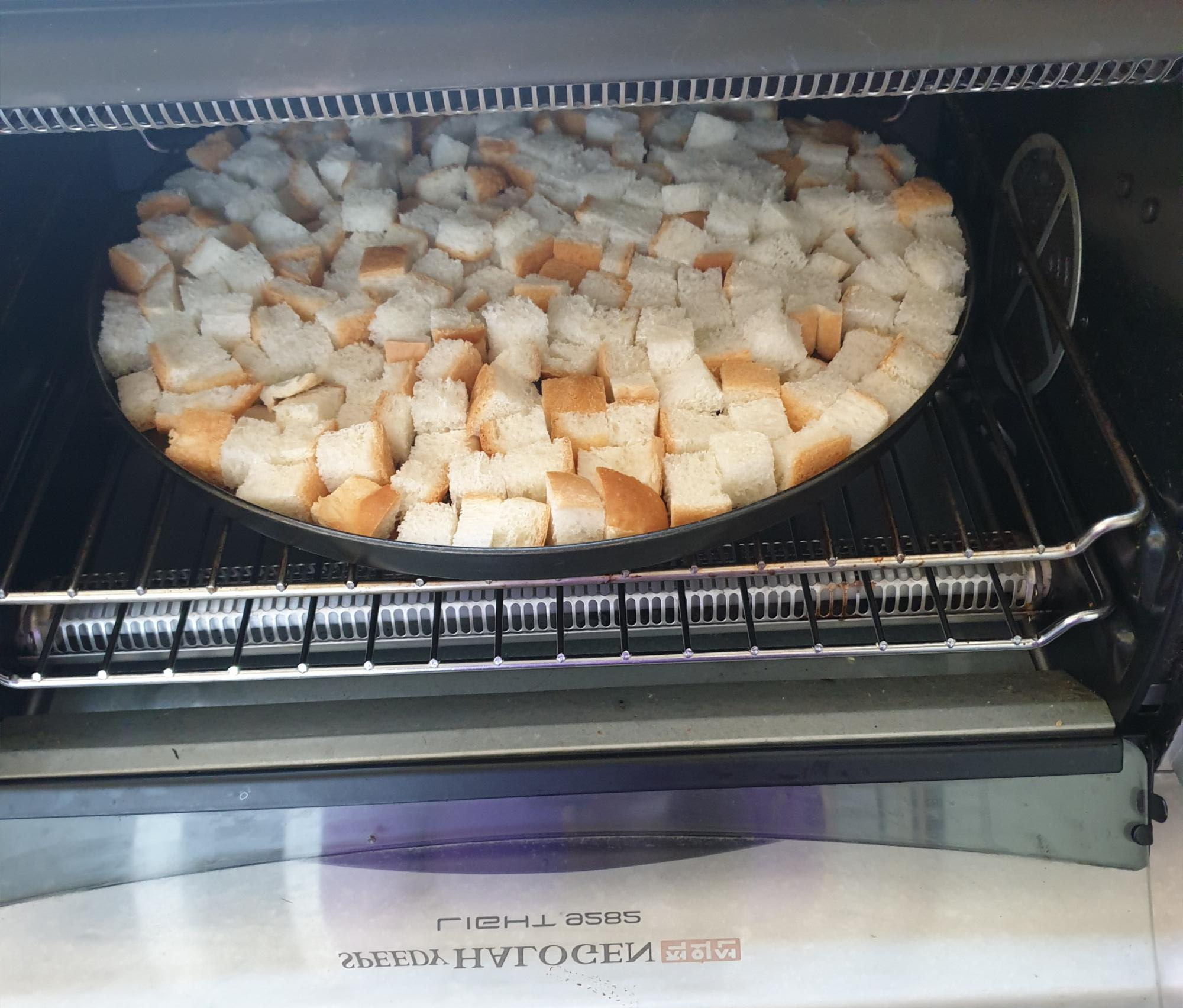 식빵을 잘게 잘라 오븐쟁반에 올립니다 식빵이 겹치지 않게 촘촘하게 정리해서 펼쳐 줍니다
