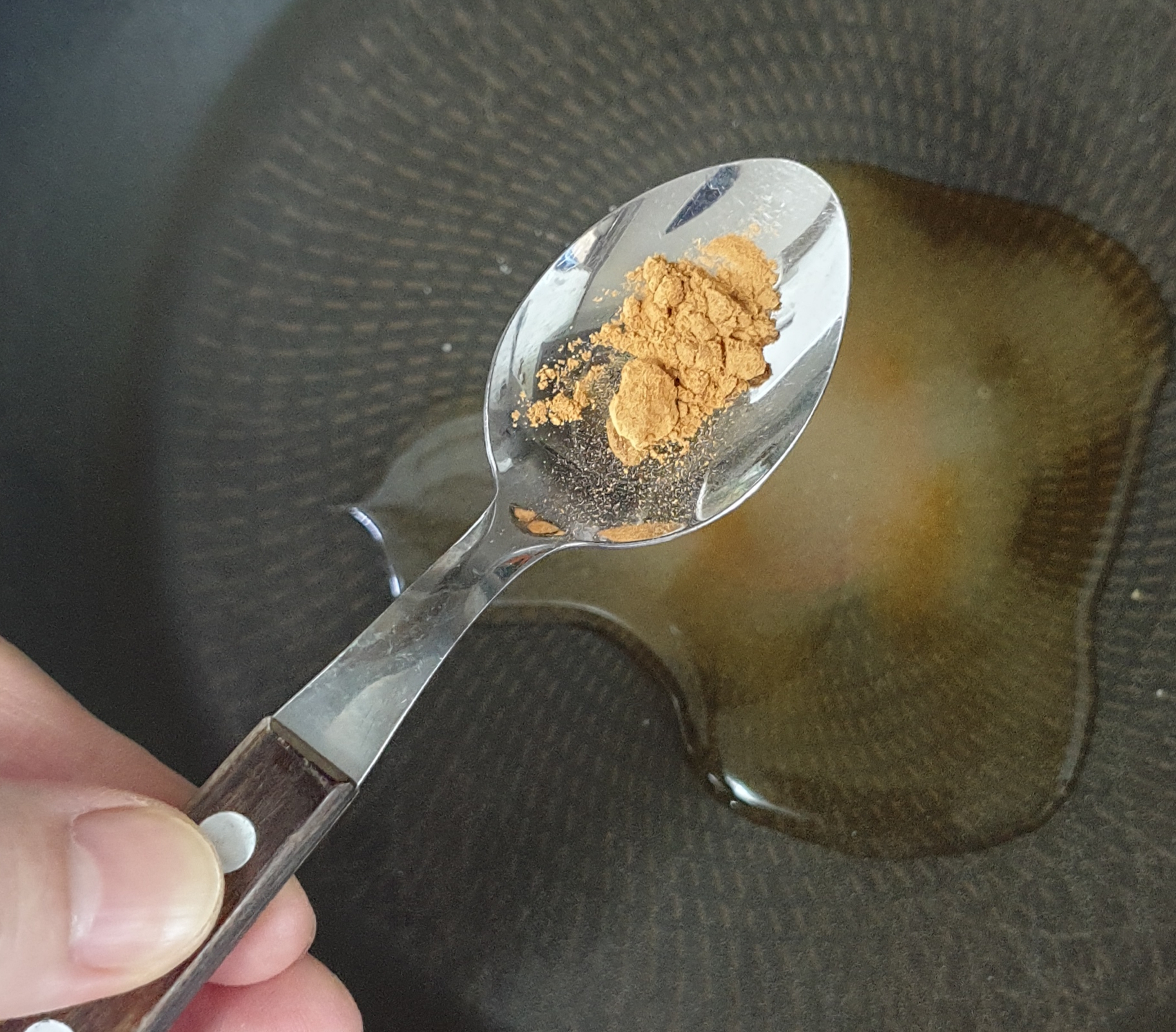 설탕물이 끓어 오를때 시나몬가루를 넣고 저어줍니다