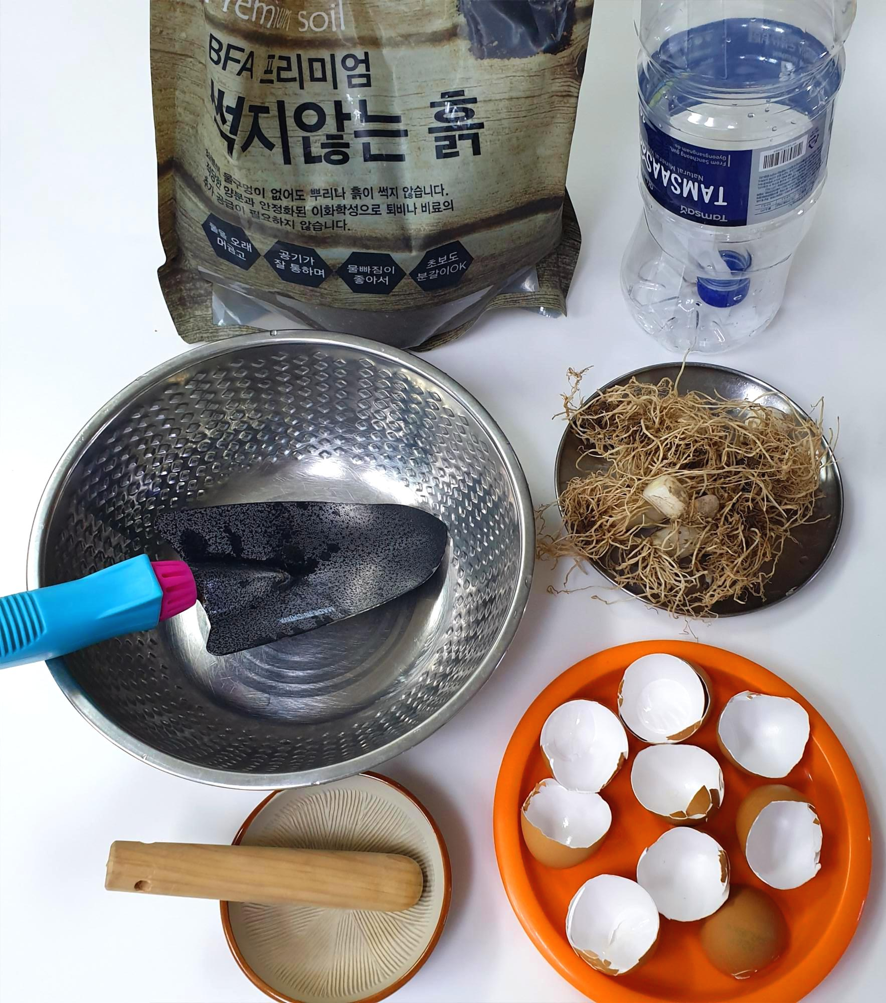 준비물: 2리터 물통 /썩지않는흙 /말린계란껍질 /물티슈