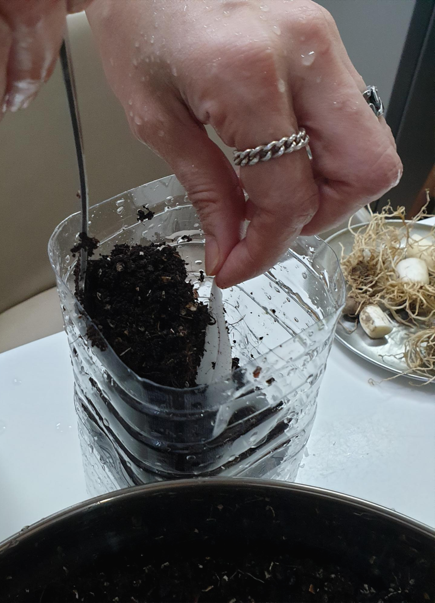 6.물티슈를 사이에두고 흙을 골고루 담습니다