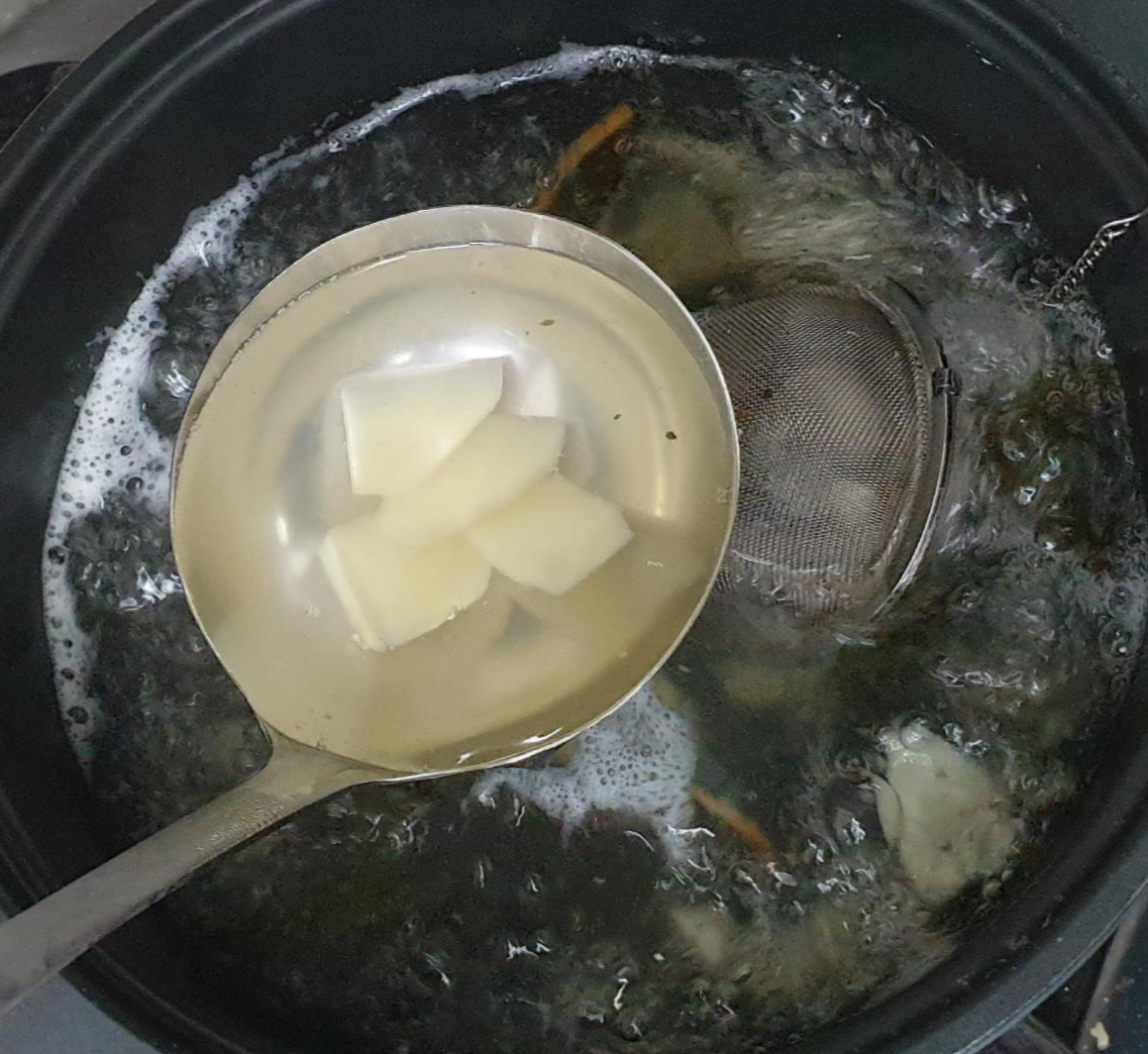 멸치육수가 끓어오르면 썰어논 감자부터 넣어줍니다
