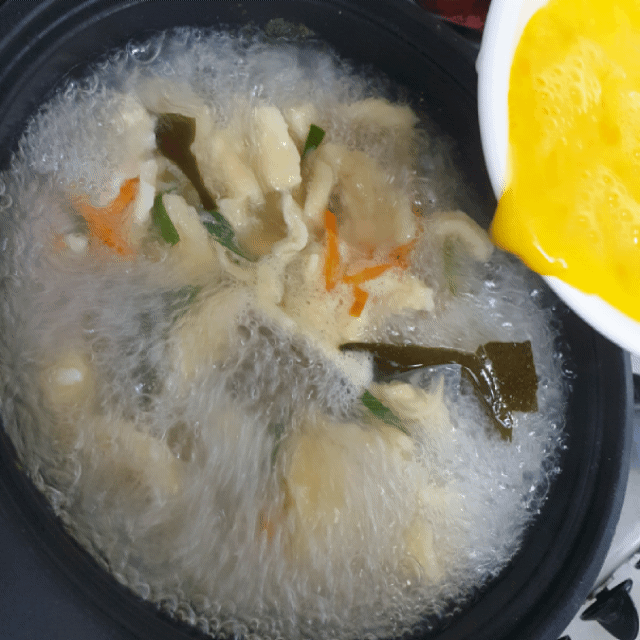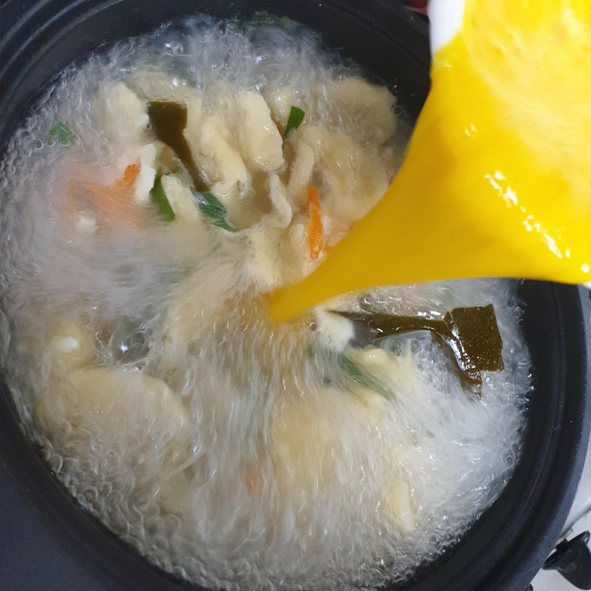 계란을 풀어 냄비위에서 원을 둘러 부어 줍니다. 끓어 오르면 계란물위에 뜨는 거품을 제거 해줍니다