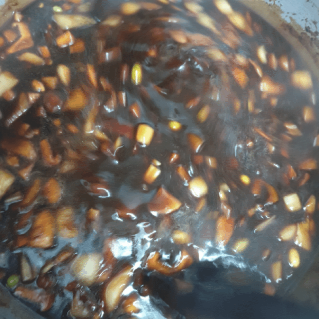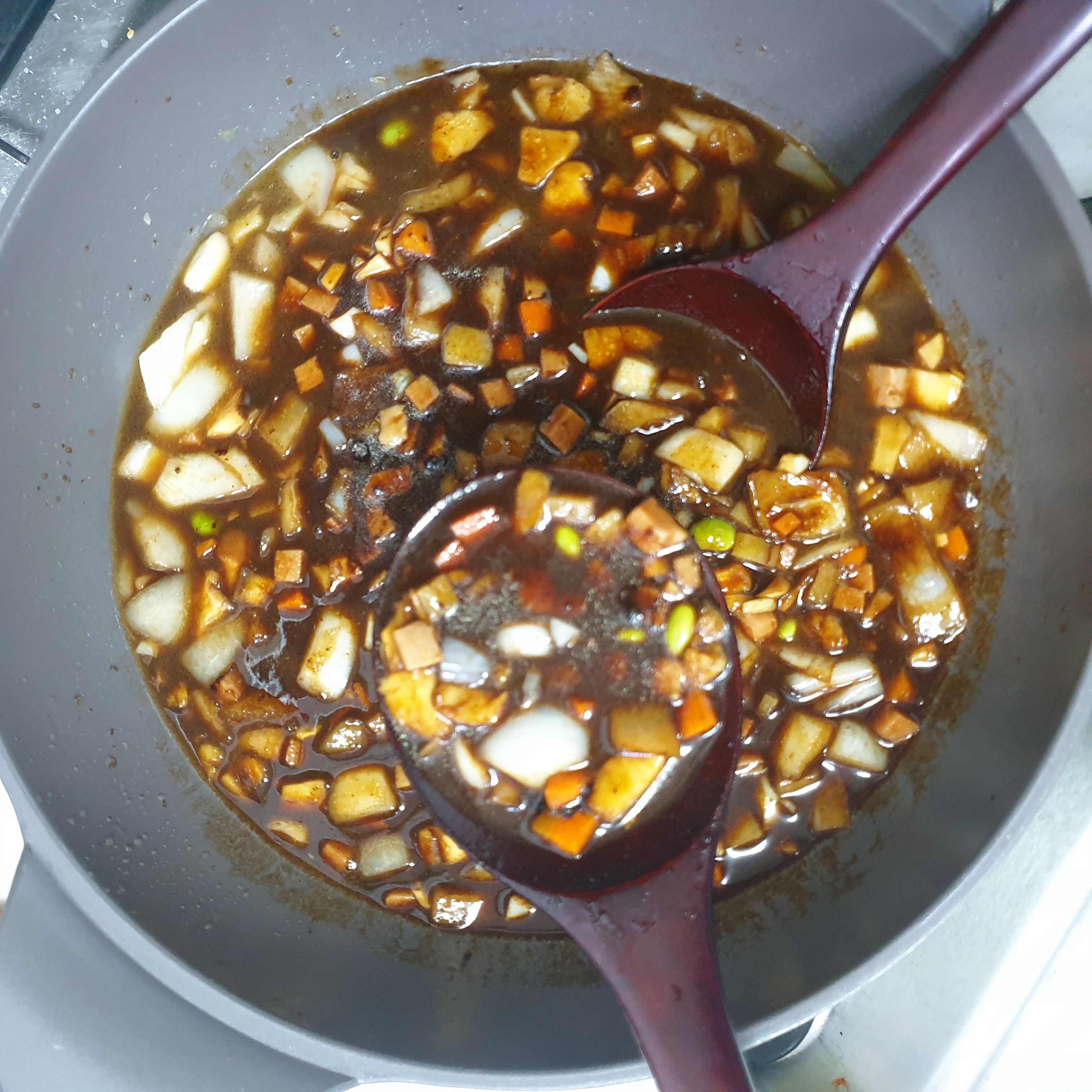 짜장가루만 넣었을때는 짠맛이 강하니 물을 넣어주시고 물엿도 조금 넣어줍니다