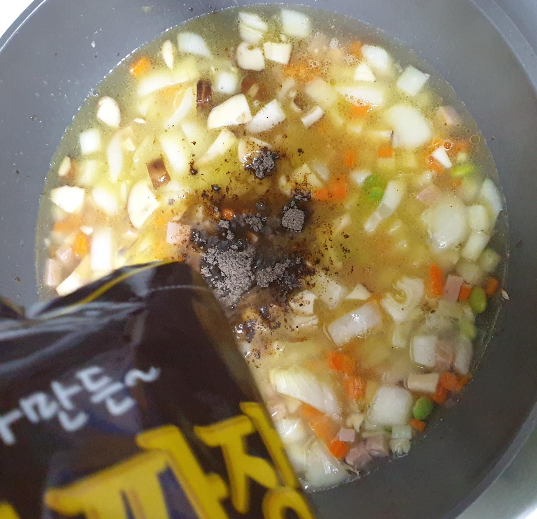 물을 부어주고 야채들이 익어갈때쯤 짜장가루 50g 넣고 가루가 뭉치지 않게 계속해서 주걱으로 짜장가루를 풀어줍니다